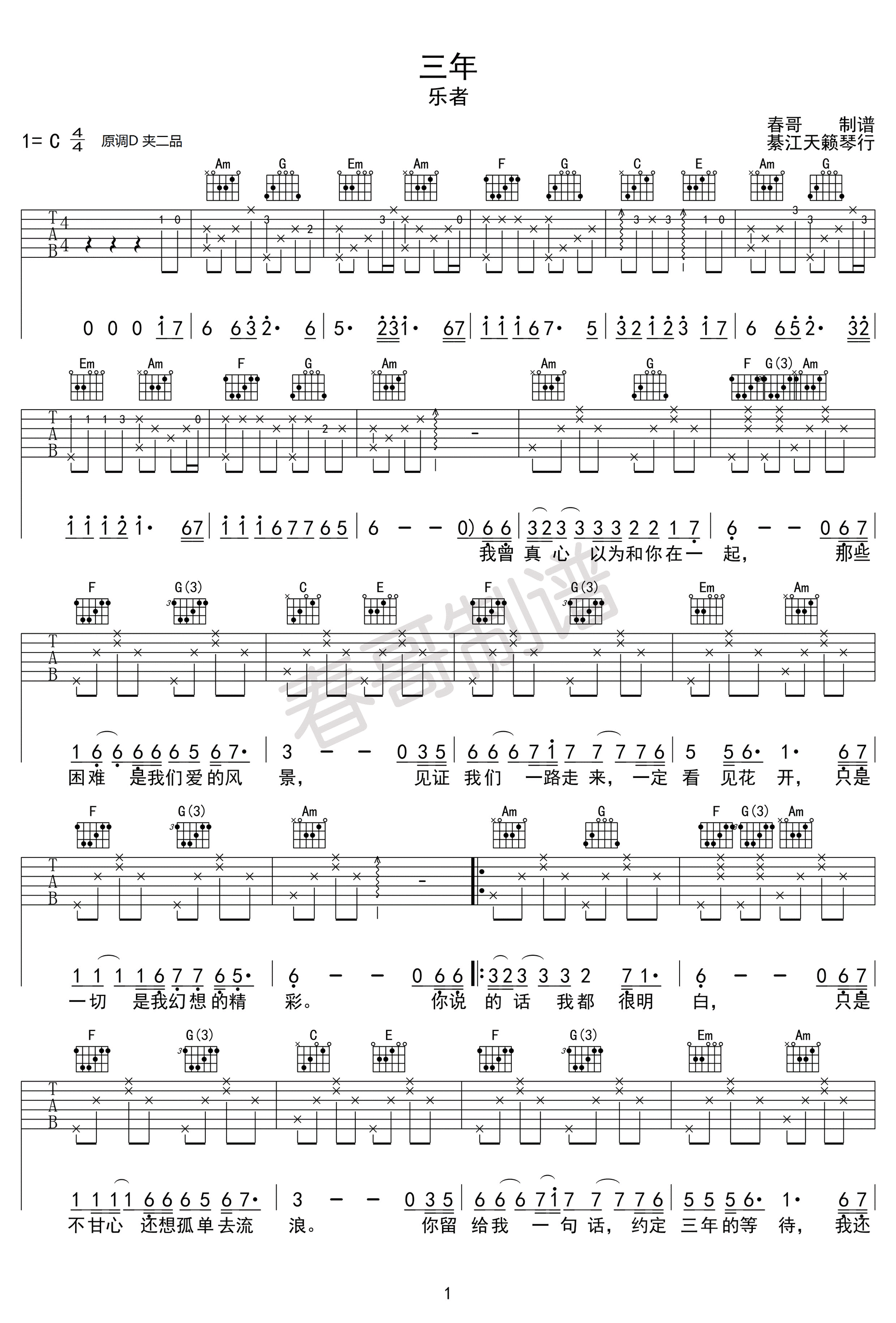 曲谱介绍: 三年吉他谱_乐者_《三年》C调弹唱六线谱_高清图片谱分享,《三年》是由乐者创作并演唱的一首原创歌曲,这首歌曲被“广东雨神”翻唱成粤语版的《三年的赌注》在各大音乐平台播放点击率破亿,被追捧为新一代神曲,同年乐者也将《三年》改编成粤语版《风中的诺言》在全网发行。乐者对音乐无比狂热,在音乐道路上有着超越自我的态度,骨子里的不羁爆发力是与生俱来天赋所赐,音乐创作而秀出真我,有实力而无所畏惧。