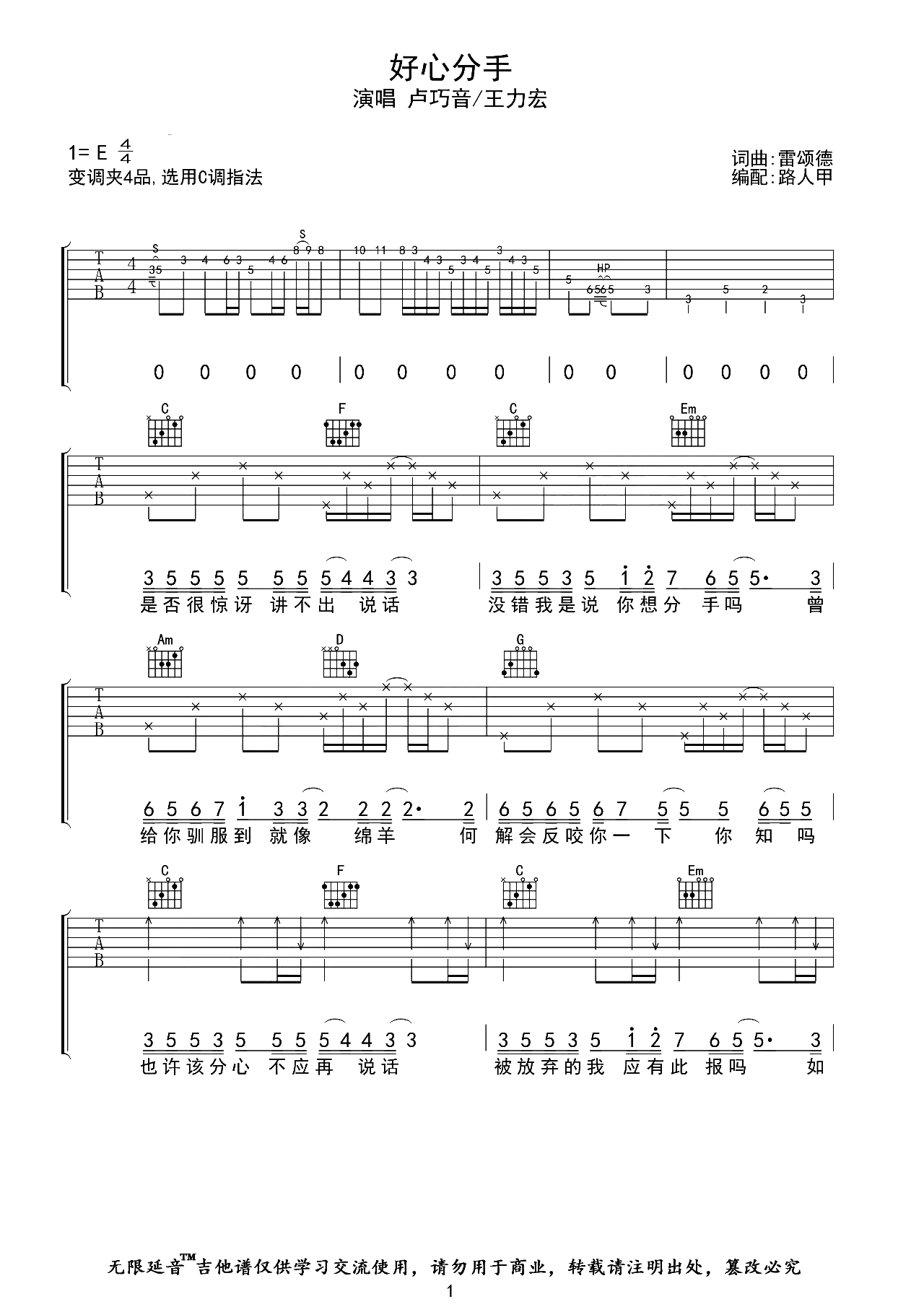 曲谱介绍: 王力宏/卢巧音《好心分手》吉他谱分享,在20年前《好心分手》在王力宏和卢巧音合唱之下,歌曲一出,动听的旋律加上交错蜿蜒的演唱形式爆红全网,让大家深深的记住了这首歌,很多时候仿佛也在告诉我们,所有的努力都让双方疲惫,不如来一场“好心分手”,也许会是对彼此更好的结果。 王力宏/卢巧音《好心分手》吉他谱,C调吉他弹唱谱,共三张高清图片谱,无限延音制谱,建议变调夹四品弹唱原调E调,版本按原版编配含前奏,弹唱难度较简单。