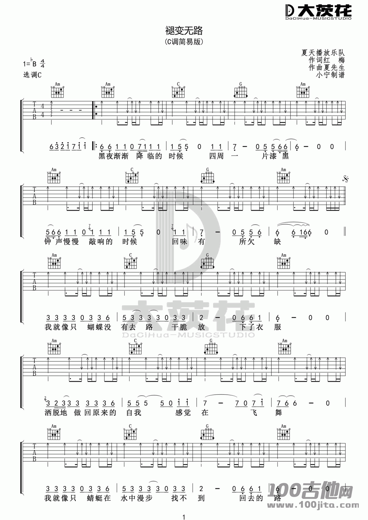 曲谱介绍: 《褪变无路》吉他谱是根据夏天播放乐队的一首歌曲编配的吉他谱,吉他谱采用C调指法编配,比较容易弹奏。这首歌曲有点黑暗的色彩。打击乐非常的有节奏感。 (C调简易版) 夏天播放乐队 1=B4 作词红梅 作曲夏先生 选调C 小宁制谱 Am - 黑夜渐渐降临的时候四周一片漆`黑 AmGm 钟声慢慢敲响的时候回味有所欠缺 我就像只蝴蝶没有去路千脆放下了衣服 DaciHud JSICSTUDIG Am 洒脱地做回原来的自我 感觉在飞舞 喜欢的朋友要弹奏一下试试哦。非常好的一首谱子。琴谱网编辑整理#