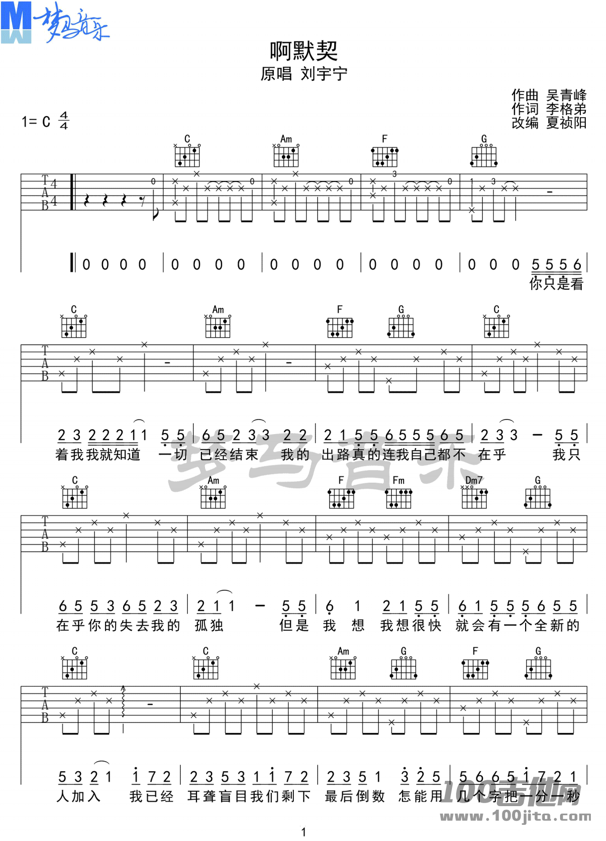曲谱介绍: 刘宇宁《啊默契》吉他弹唱谱,采用C调指法编配,共有3张高清图谱。