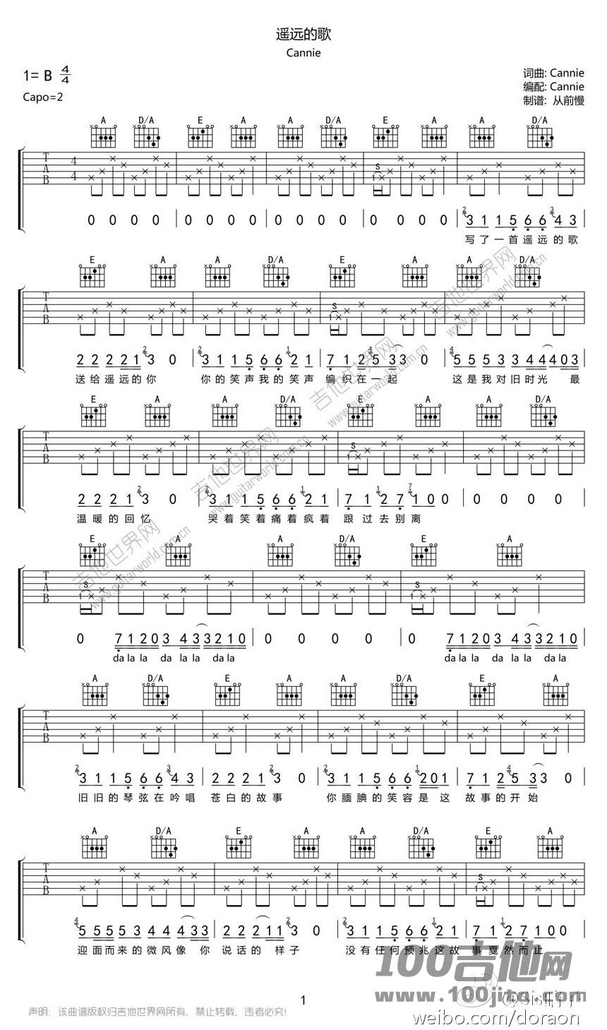曲谱介绍: Cannie《遥远的歌》吉他弹唱谱,采用A调指法编配原版,共有2张高清图谱,免翻页排版设计。