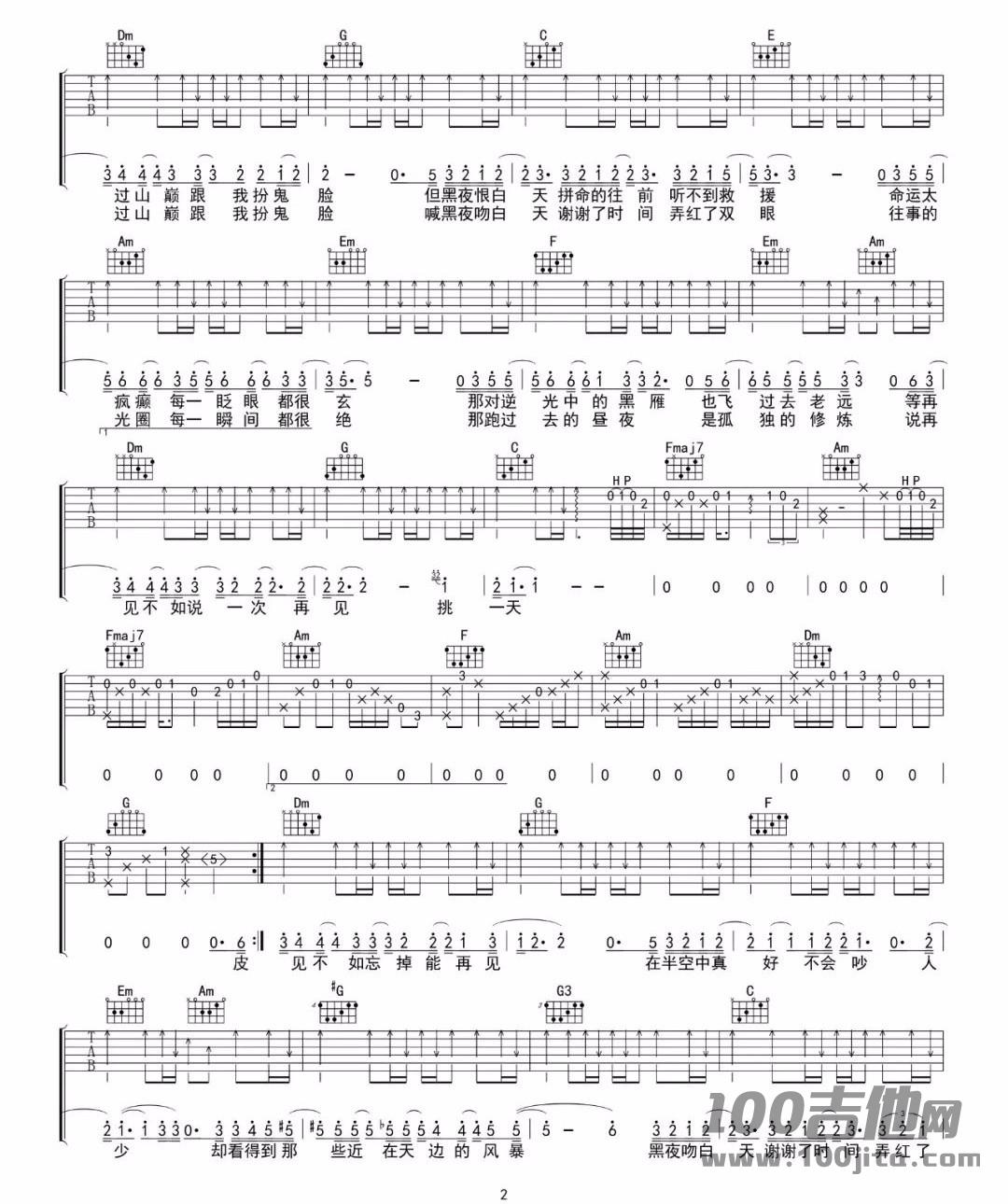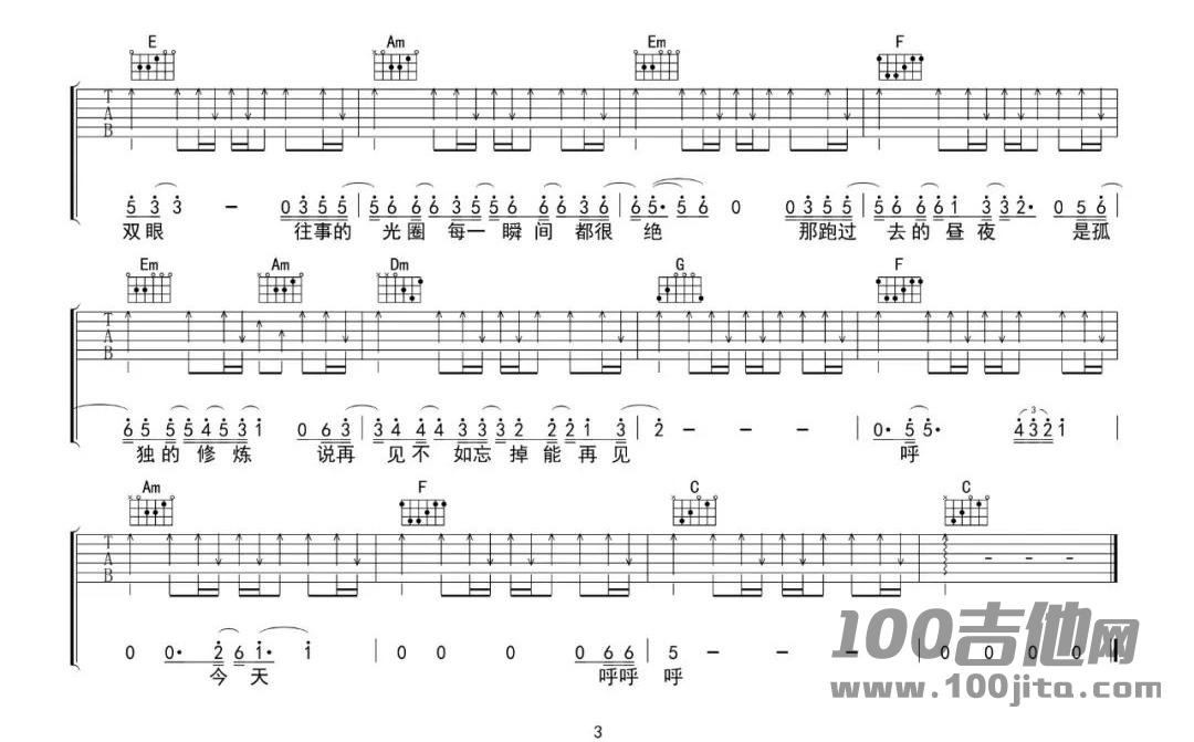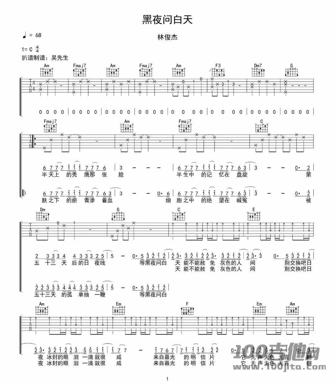 曲谱介绍: 林俊杰《黑夜问白天》吉他弹唱谱,采用C调指法编配原版,共有3张高清图谱。