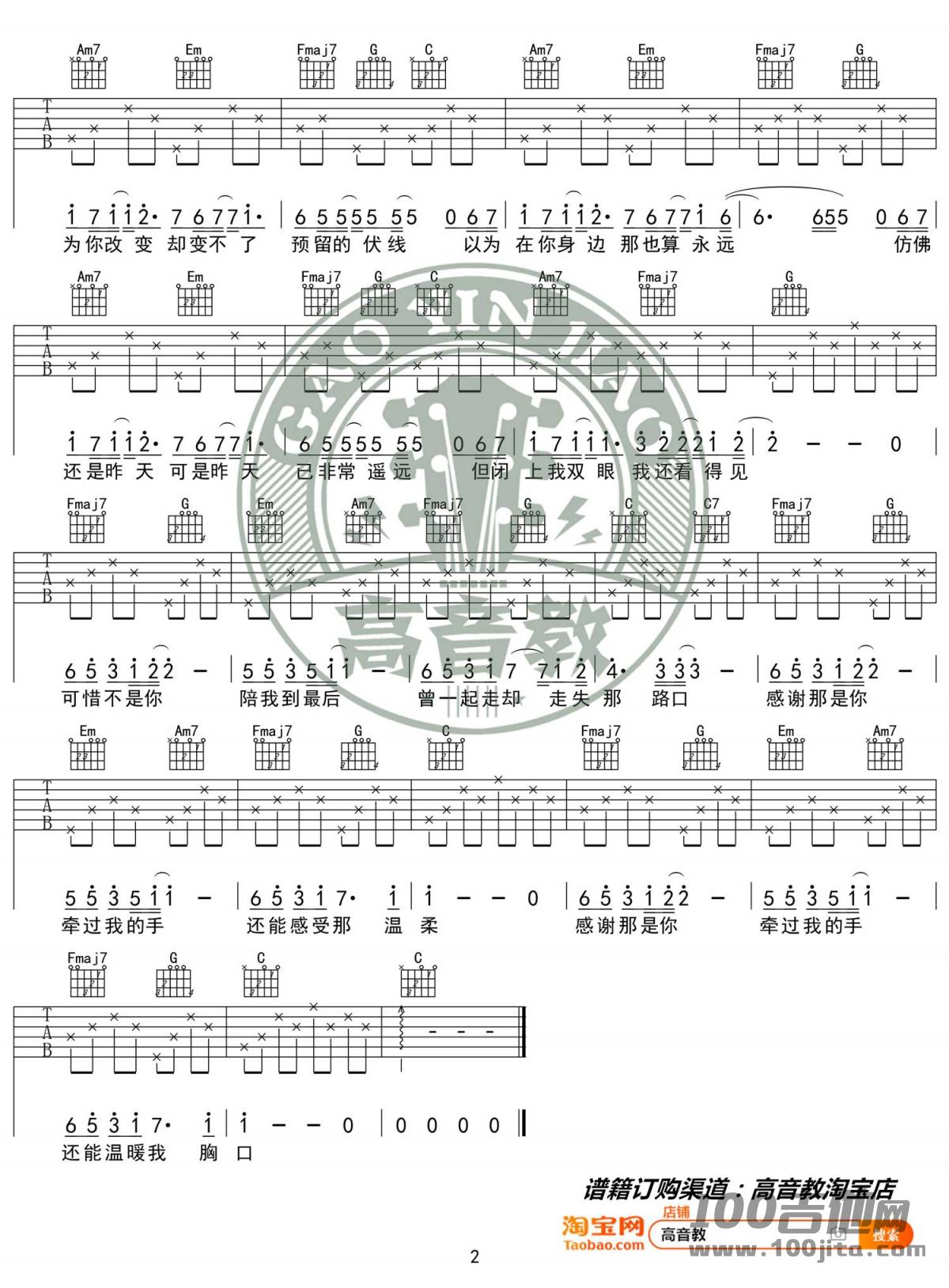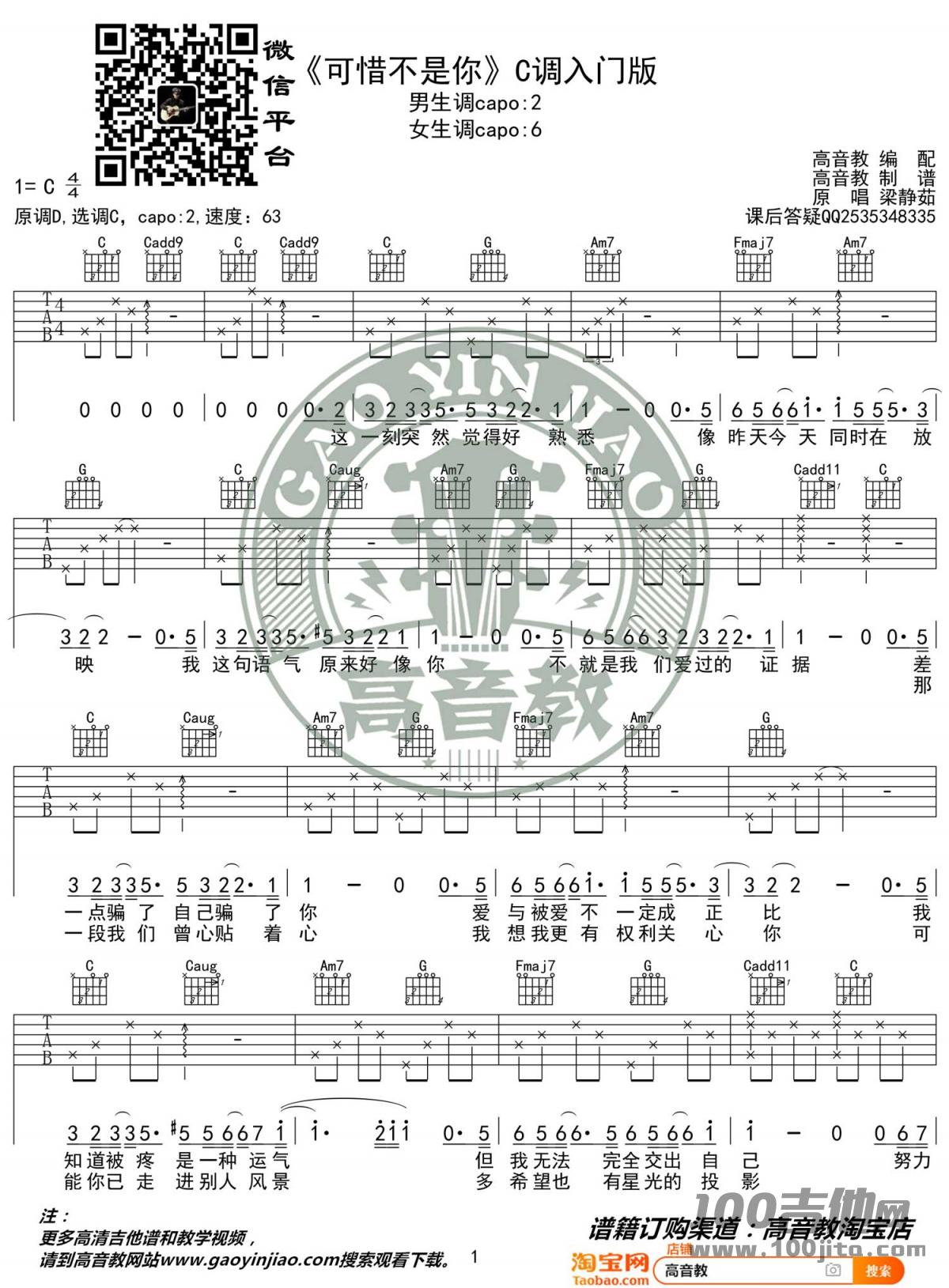 曲谱介绍: 梁静茹《可惜不是你》吉他弹唱谱,采用C调指法编配,共有2张高清图谱,免翻页排版设计。