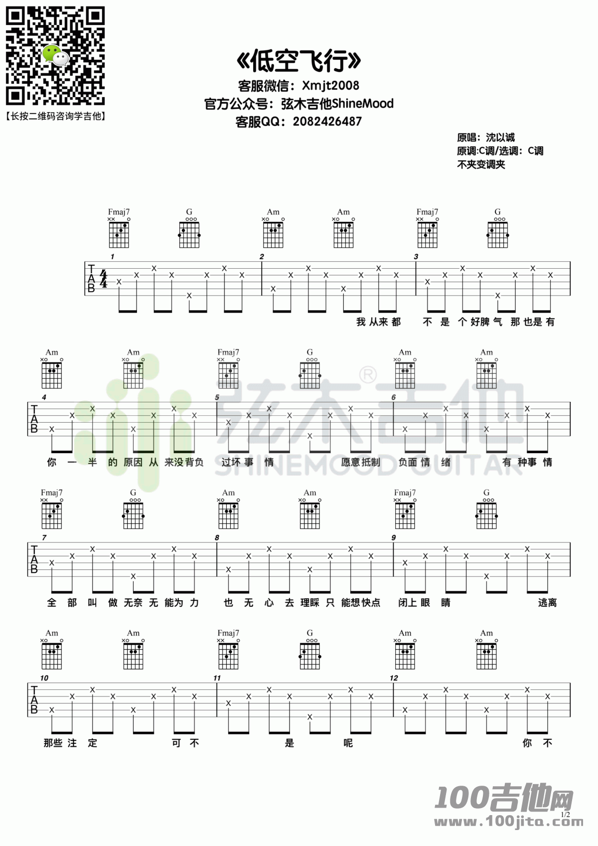 曲谱介绍: 沈以诚《低空飞行》吉他弹唱谱,采用C调指法编配,共有2张高清图谱,免翻页排版设计。