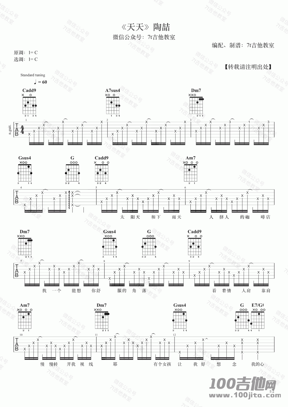 曲谱介绍: 陶喆《天天》吉他弹唱谱,采用C调指法编配,共有2张高清图谱,免翻页排版设计。