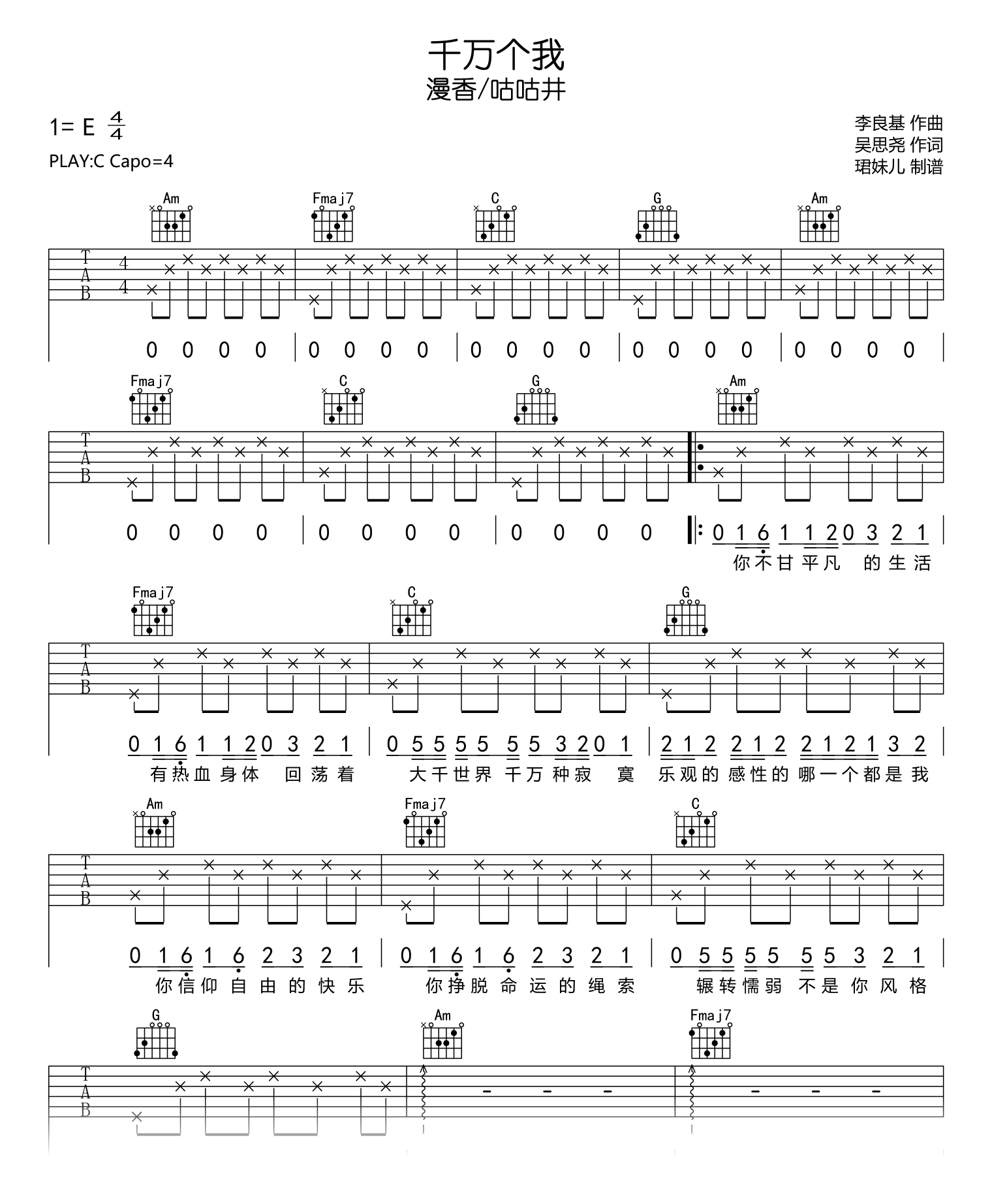 曲谱介绍: 千万个我吉他谱,漫香/咕咕井演唱,一首节奏轻快的歌曲。千万个我吉他弹唱谱,原调E,选用C调指法编配,建议CAPO夹4品,速度95BPM,难度较简单,弹奏易上手。