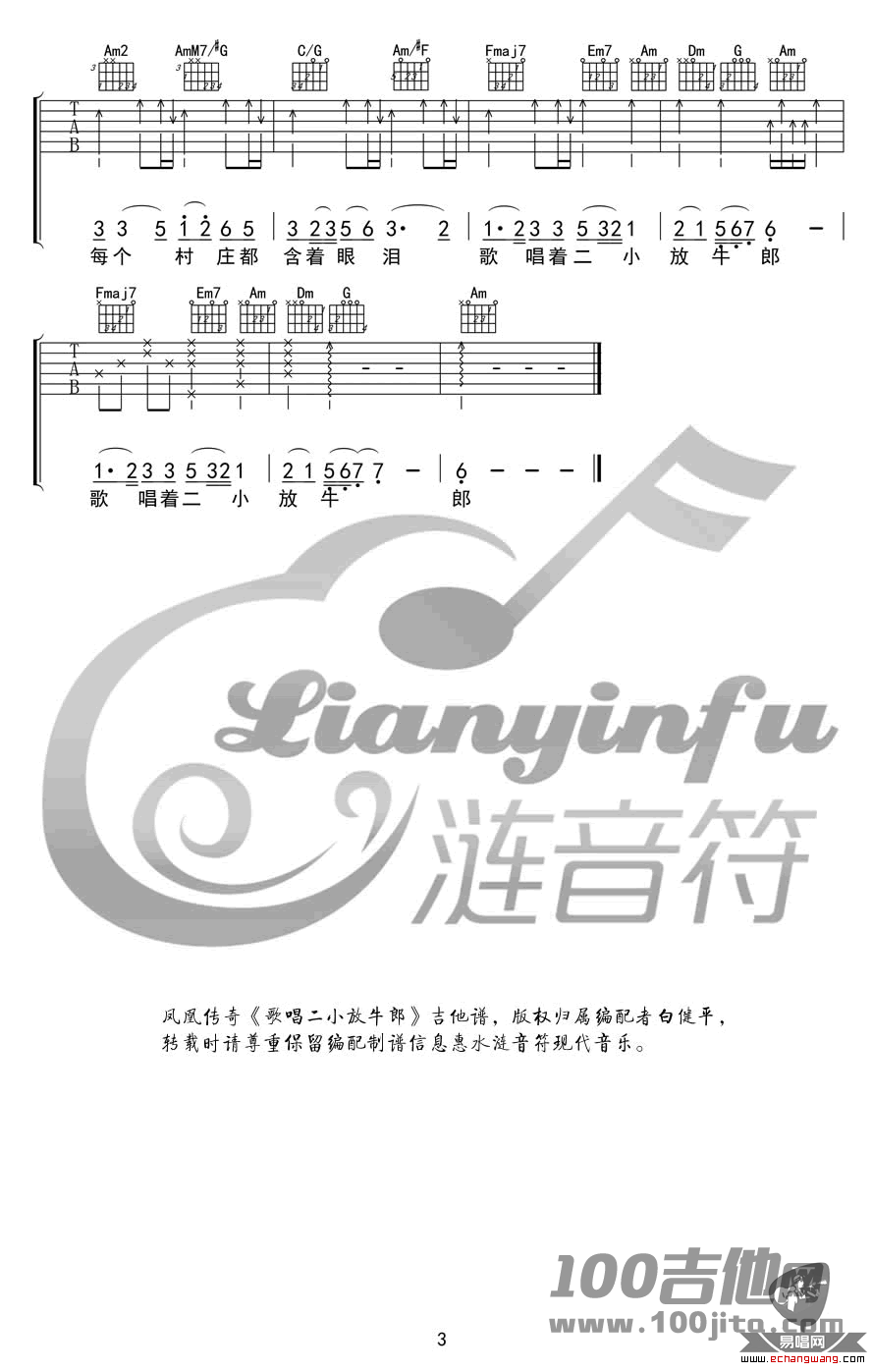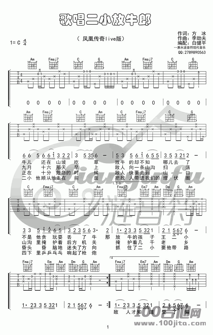 曲谱介绍: 凤凰传奇《歌唱二小放牛郎》吉他弹唱谱,采用C调指法编配,共有3张高清图谱。
