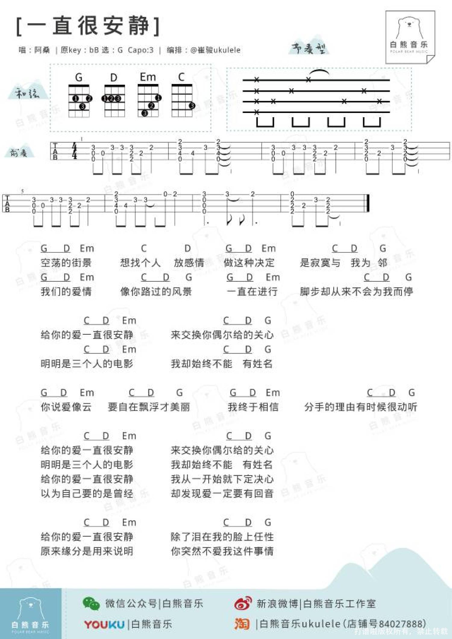 曲谱介绍: 阿桑《一直很安静》_G调尤克里里谱