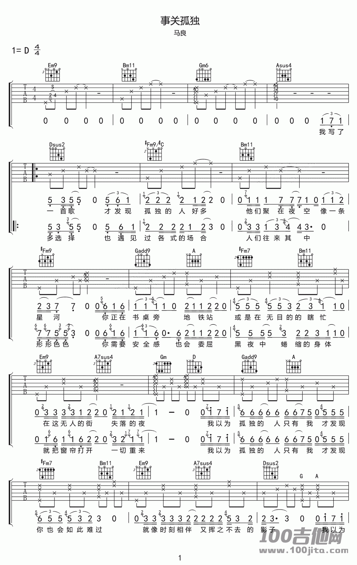 事关孤独吉他谱 - 马良 - D调吉他弹唱谱