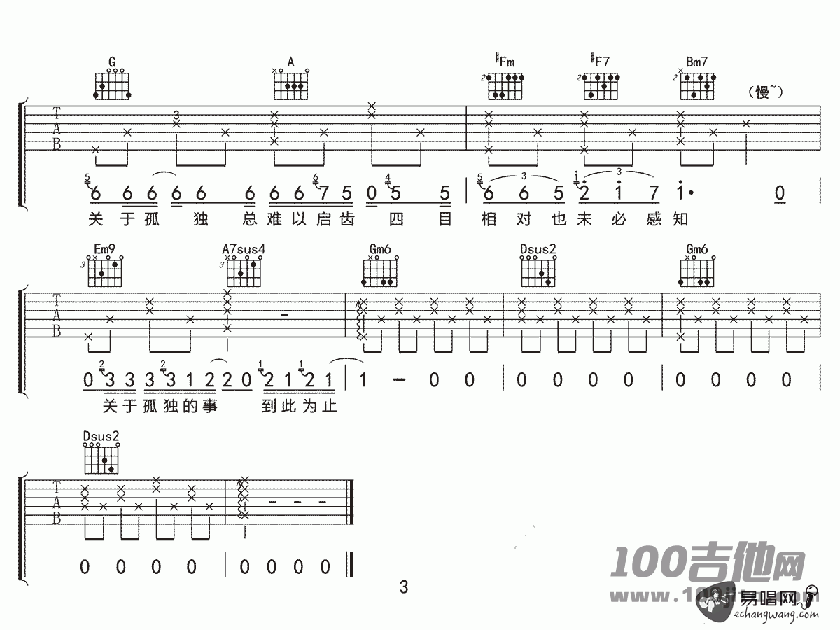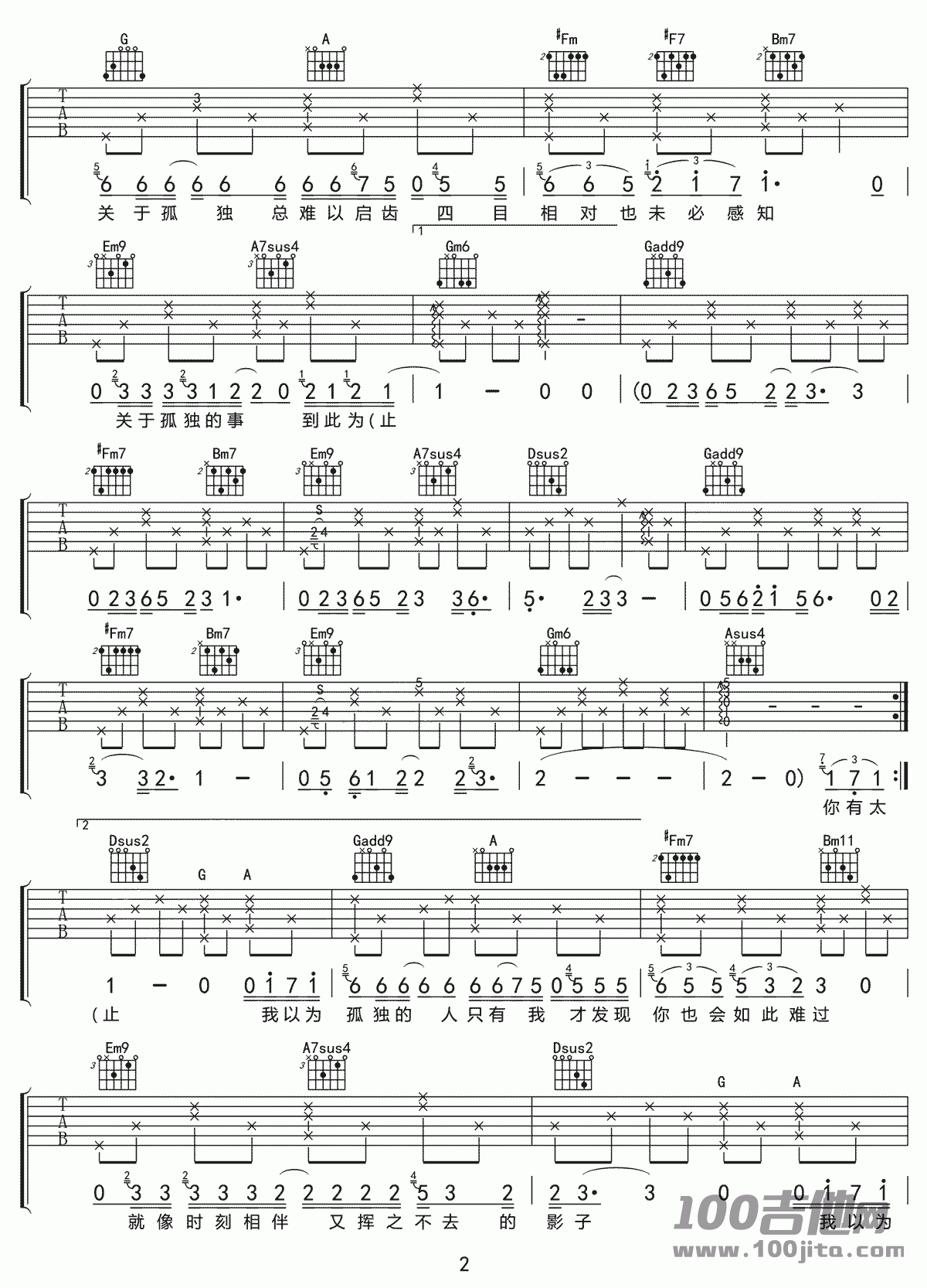 曲谱介绍: 马良《事关孤独》吉他弹唱谱,采用D调指法编配,共有3张高清图谱。