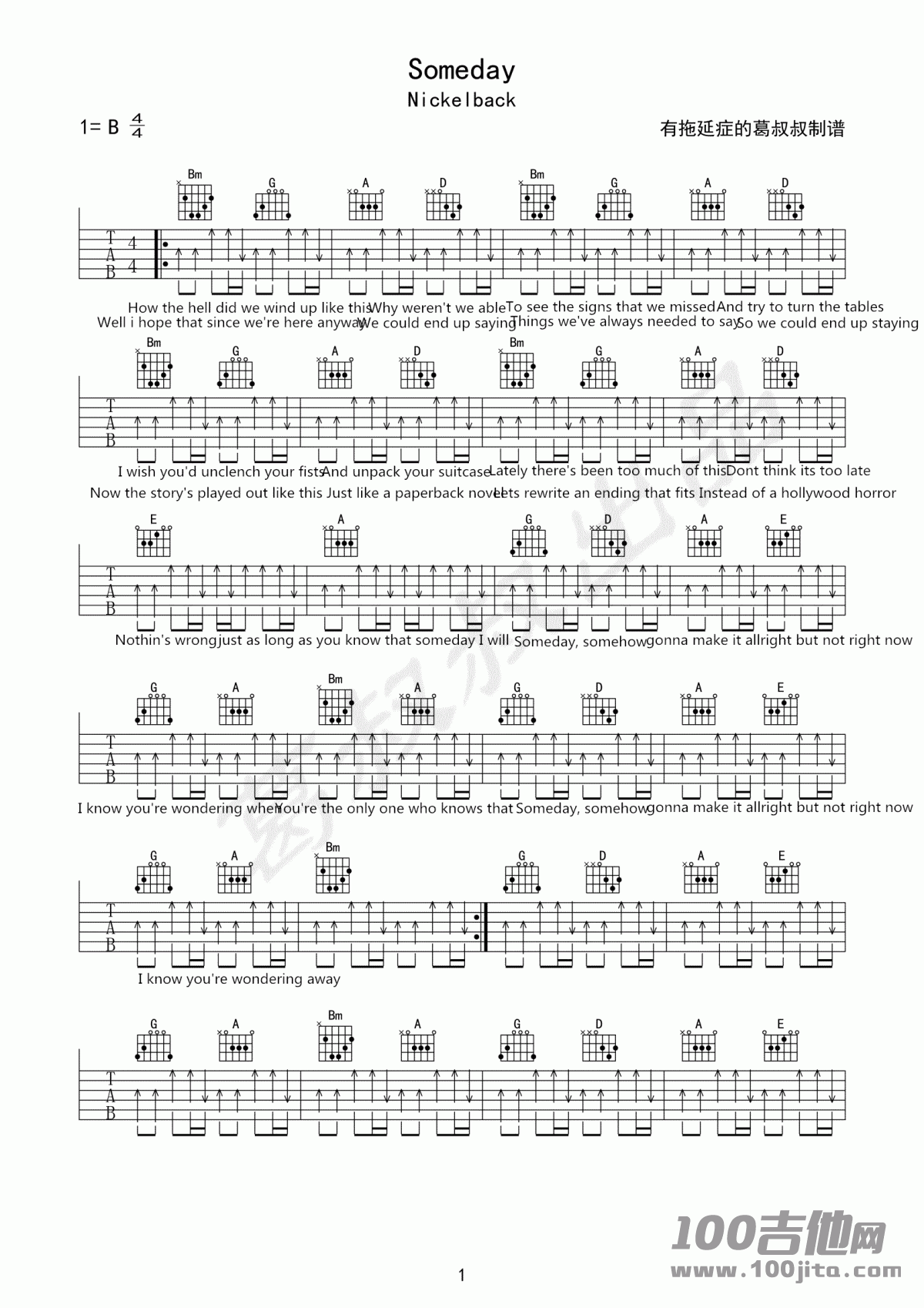 曲谱介绍: 《Someday》吉他谱是根据歌手Nickelback唱的一首歌曲编写的吉他谱。吉他谱采用D调原版编配,非常好听的一首歌曲。 Someday Nickelback1=B4 有拖延症的葛叔叔制谱 Bm How the hell did w hy weren't we ableTo see the signs that we missedAnd try to turn the tables Well i hope that since ould end up sayinghings we've always needed to sayso we could end up staying Bm I wish yo Dont think its too late Now the story's played out like this ead of a hollywood horror Nothin's wrongjust as long as you know that so out not right now I know you're wondering wheMou're the only one who knows that Someday, somehowgonna make it allright but not right nowG I know you're wondering away Bm 琴谱网 编辑整理一首不错的英文歌曲 SomeDay 喜欢的朋友记得收藏哦
