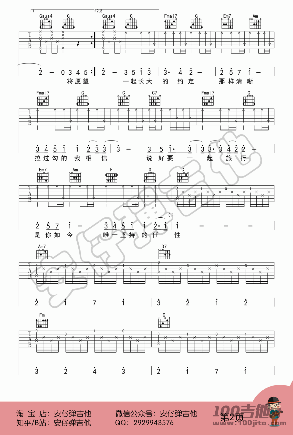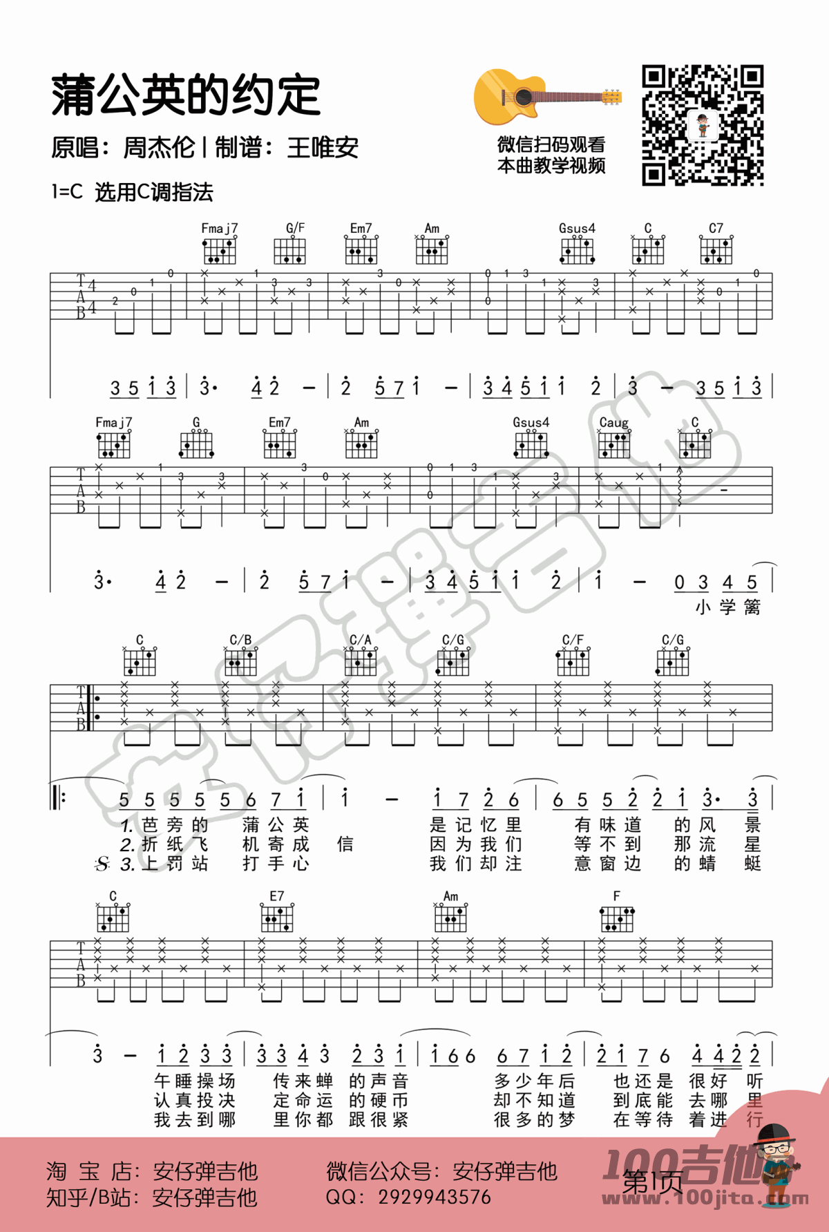 曲谱介绍: 周杰伦《蒲公英的约定》吉他弹唱谱,采用C调指法编配,共有3张高清图谱。