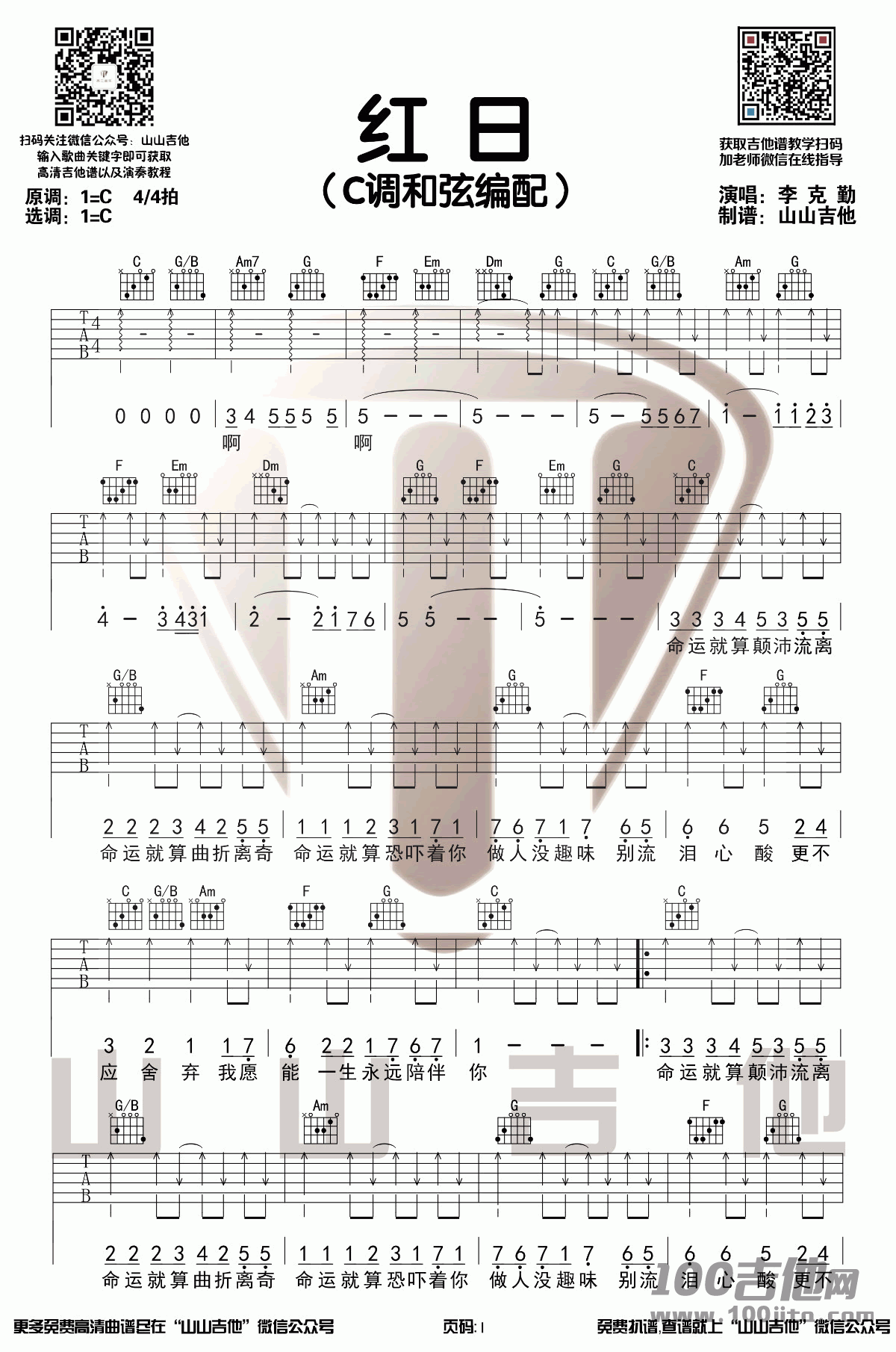 曲谱介绍: 李克勤《红日》吉他弹唱谱,采用C调指法编配,共有3张高清图谱。