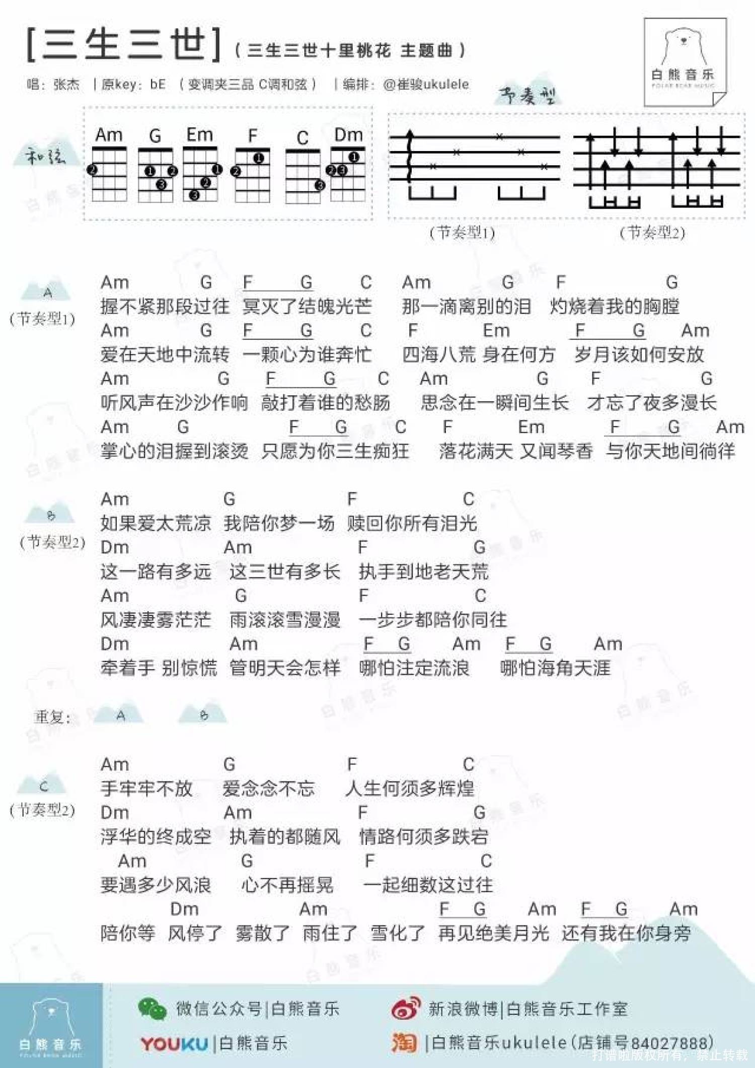 曲谱介绍: 张杰《三生三世》_C调尤克里里谱
