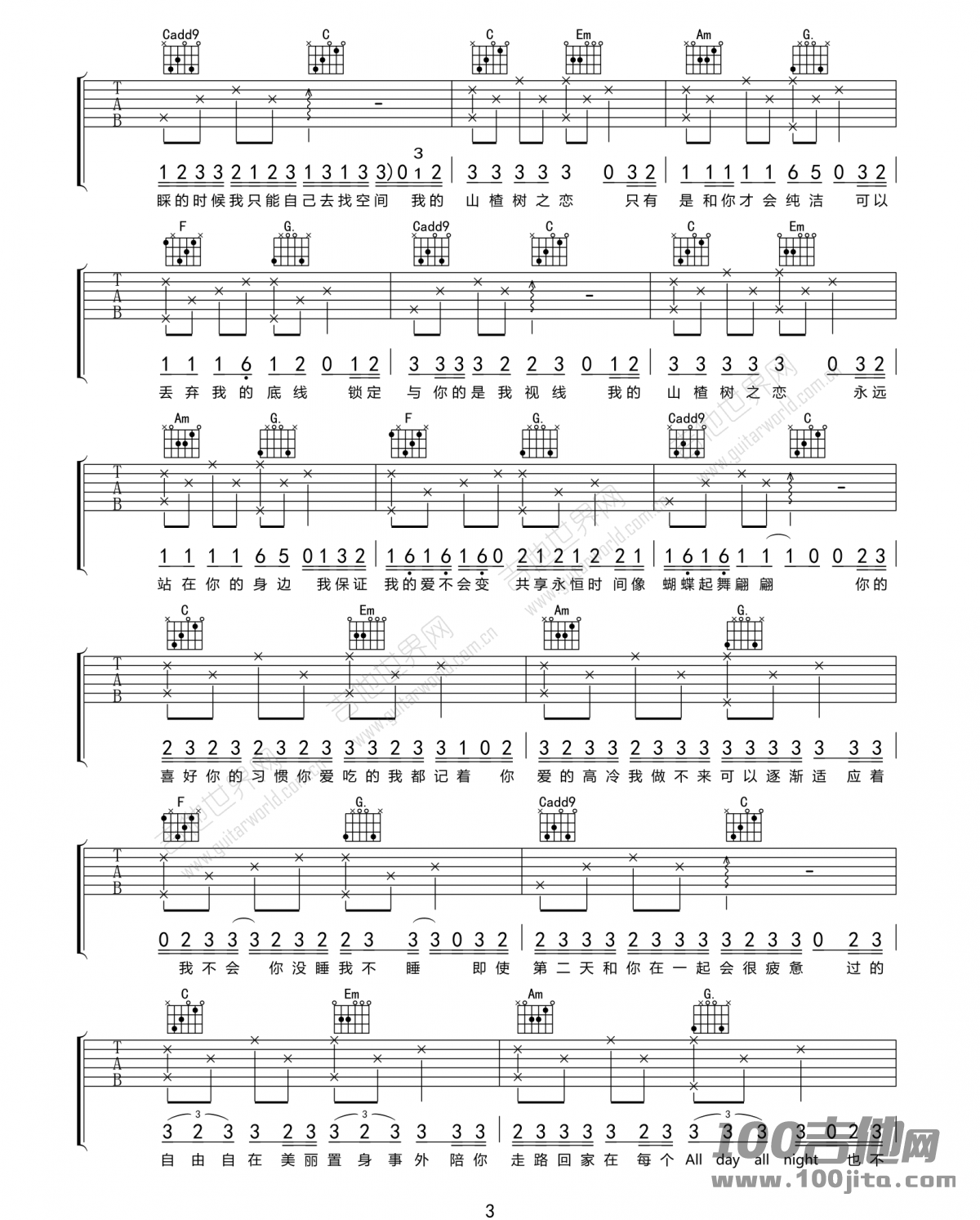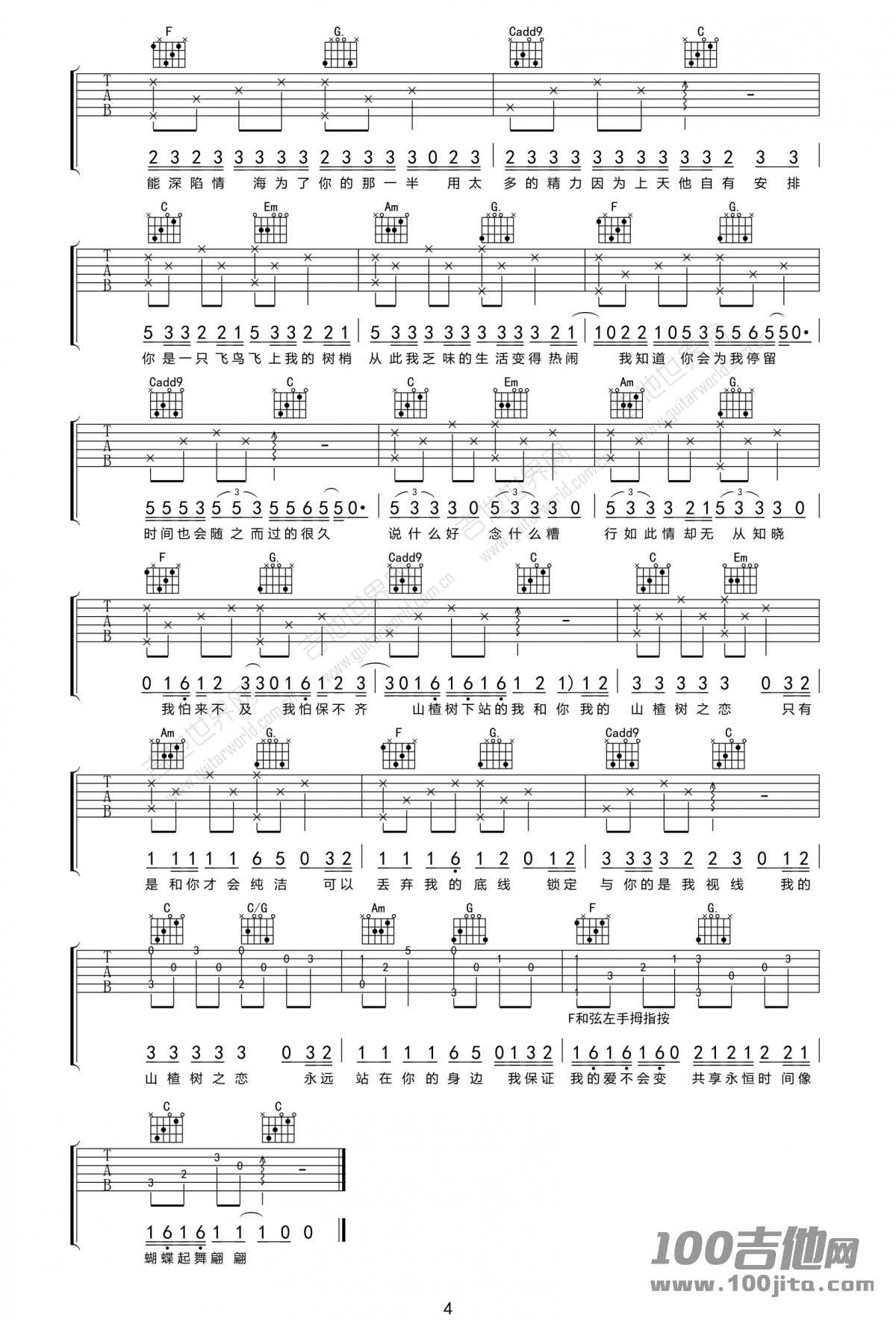 曲谱介绍: 周队《山楂树之恋》吉他弹唱谱,采用C调指法编配,共有4张高清图谱。
