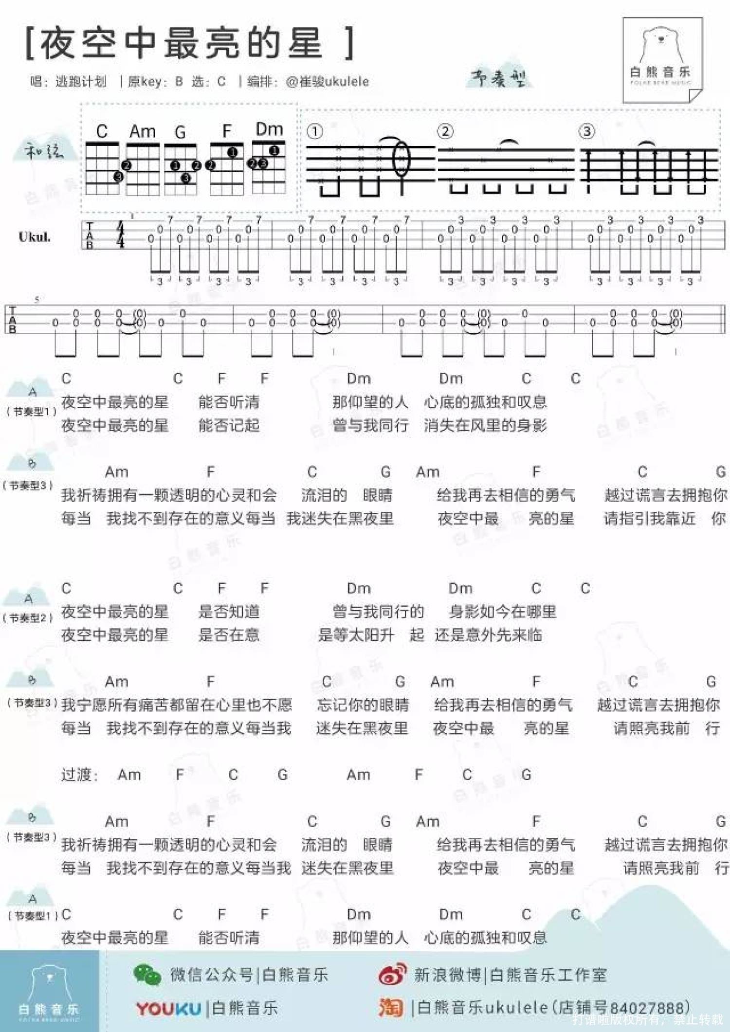 曲谱介绍: 逃跑计划《夜空中最亮的星》_C调尤克里里谱