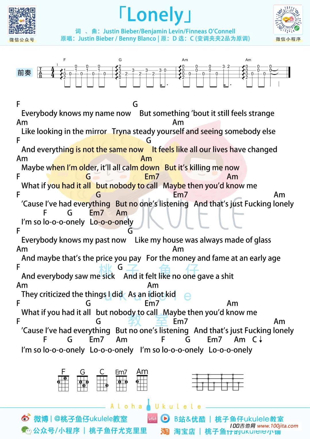 曲谱介绍: 《Lonely》尤克里里谱是根据歌手Justin Bieber(比伯)联手Benny Blanco推出的新歌编配的谱子,歌曲原调D,谱子采用C调编配。变调夹夹二品。这首歌曲也是刚刚(2020年10月16日)发布。年纪轻轻成名了,但是好多人只看到名人的光鲜亮丽,无法体会其背后的辛酸和孤独。虽然拥有了物质上的一切,但是精神上的寄托无法安放。歌曲表达了那种越长大越孤独的内心感受。年上成名的他不一定想局外人看到的那样富有,他更崇尚精神的丰富。这首歌曲也是唱出了自己的真实想法吧。喜欢这首歌曲的朋友拿起尤克里里弹唱吧。谱子是桃子鱼仔编配,琴谱网编辑整理。