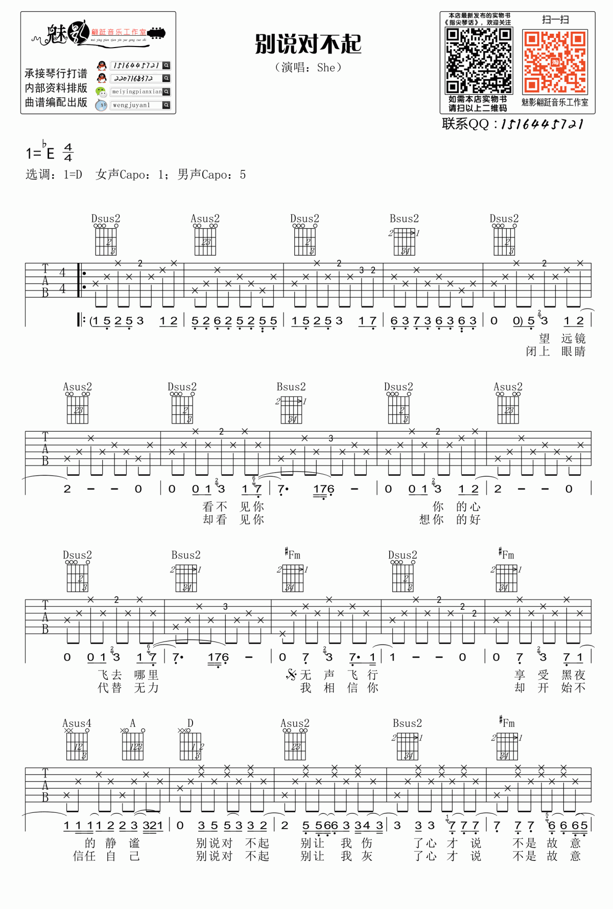 曲谱介绍: 别说对不起吉他谱是根据台湾组合S.H.E的一首经典老歌编配的谱子,非常好听的歌曲,别说对不起不要让我伤心了才说对不起,比较活泼诙谐的恋爱情感,那种小调皮的初恋形象让she演绎了出来。歌曲原D调,C调指法编配,变调夹夹五品。还有另一个梦幻乐谱版,喜欢的朋友可以选择哦。琴谱网编辑整理。