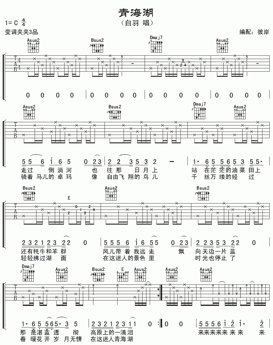 曲谱介绍: 青海湖吉他谱是根据歌手白羽的一首经典歌曲编配的谱子,谱子c调指法编配,变调夹夹三品。这首民谣歌曲是白羽歌颂青海湖美景的歌曲,感受到了青海湖那自然的美景和各种美丽花朵带给心灵的震撼。和弦弹奏的时候注意一下要点。Bsus2和弦和Dmaj7和弦的按法。多练多弹就可以熟练掌握哦。歌曲带有浓郁的民族特色,吉他和弦的编配也是按照这个原则,去掉了一些和弦的音。吉他谱弹起来有中国风格。喜欢的朋友试试哦。琴谱网编辑整理。