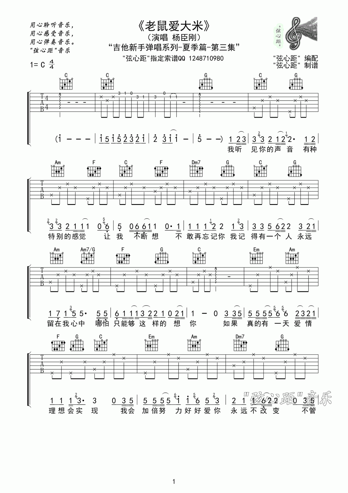 曲谱介绍: 老鼠爱大米吉他谱是根据网络歌手杨臣刚的一首经典歌曲编配的吉他谱。这首歌曲在那个年代的网络中火了。可以说是网络爱情歌曲的鼻祖。谱子采用C调编配非常容易弹奏。建议初学者试试。老鼠在偷东西的时候爱吃大米。歌曲也把对她的喜欢比作成自己最爱的食物。表达了那份恋恋不舍的爱情感受。不管现实有多苦我的信念永不变。喜欢的朋友记得收藏哦,琴谱网编辑整理。