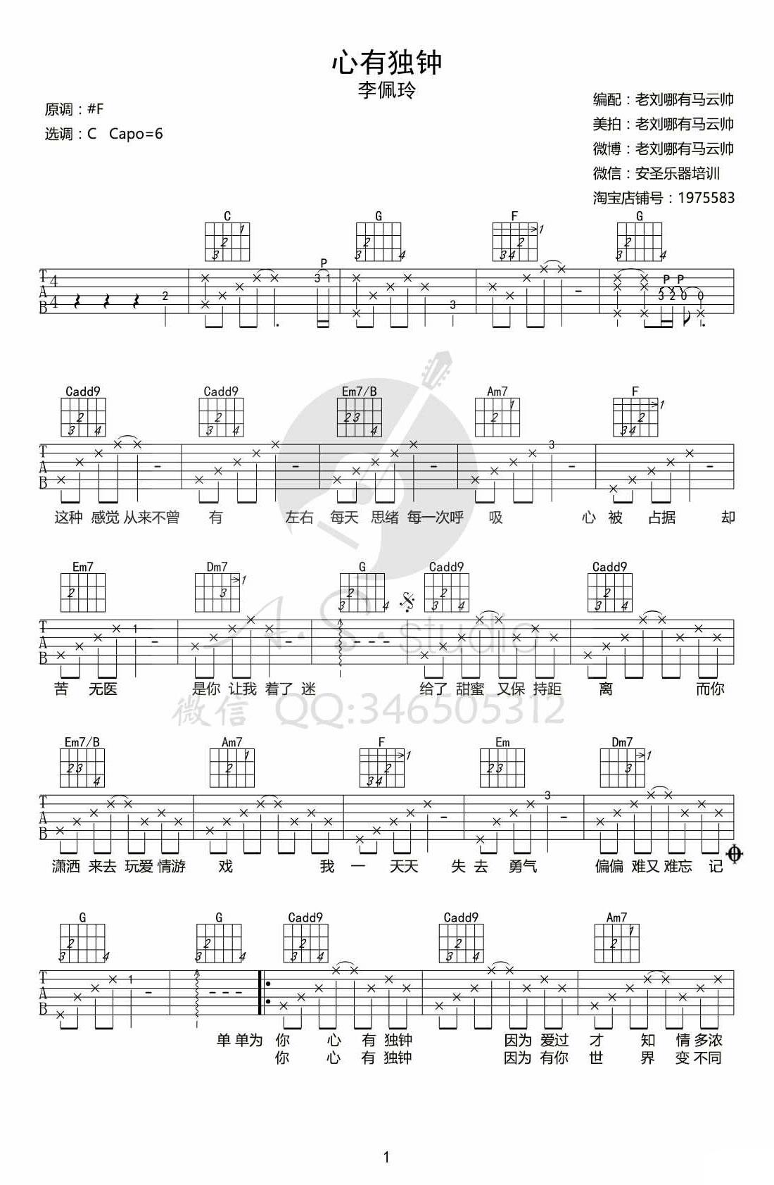 曲谱介绍: 《心有独钟》吉他谱是根据中国新歌声栏目里选手李佩玲的一首歌曲编配的吉他谱。歌曲原调#F,谱子采用C调编配,弹奏的时候变调夹夹六品回原调。这首歌曲的原唱是陈晓东,不过经过李佩玲翻唱的版本比较好听不输原唱所以被人广为传唱。本谱子就是此版本。旋律优美歌词句句扎心。喜欢的朋友试试此版本哦。琴谱网编辑整理。。