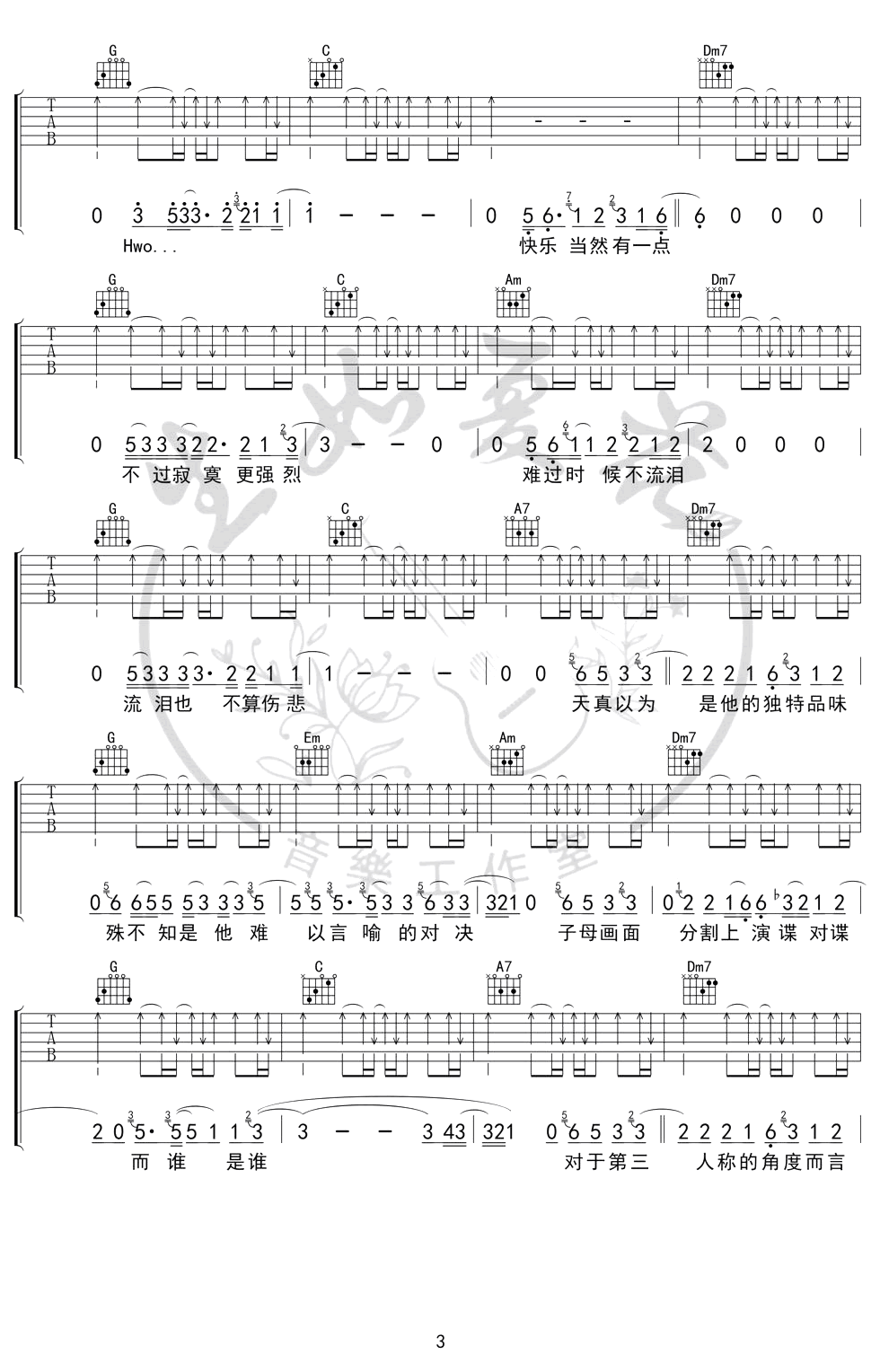 曲谱介绍: 《第三人称》吉他谱是根据HUSH的一首歌曲编配的吉他谱。歌曲原调B,本谱子采用C调指法,降半音调弦编配。三张图片六线谱。一首好听的歌曲,一首带有哲理的歌曲。喜欢坐下来弹吉他慢慢聆听的朋友不要错过。琴谱网编辑整理#(更新了唯音悦、音艺版)喜欢的朋友试试哦。