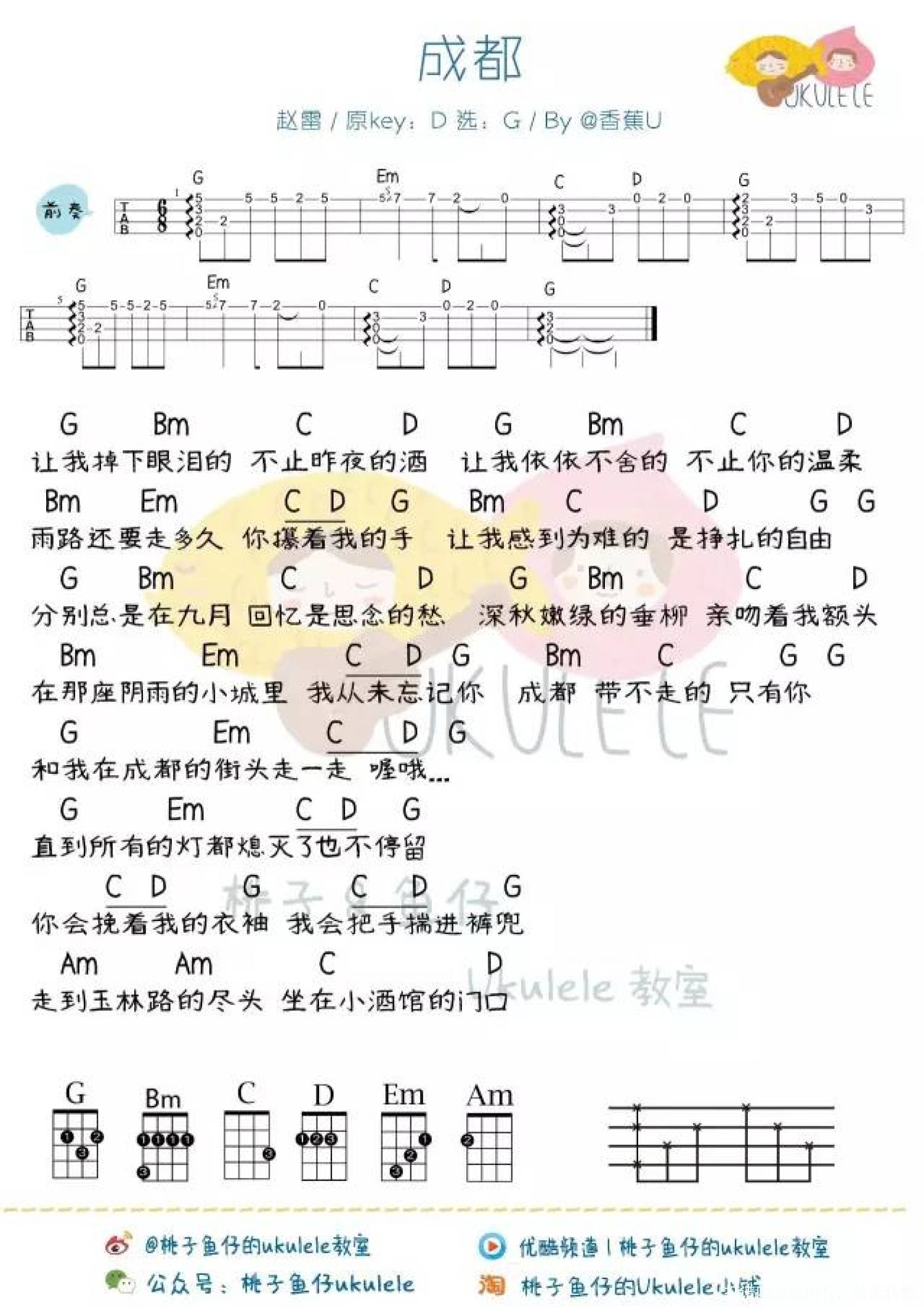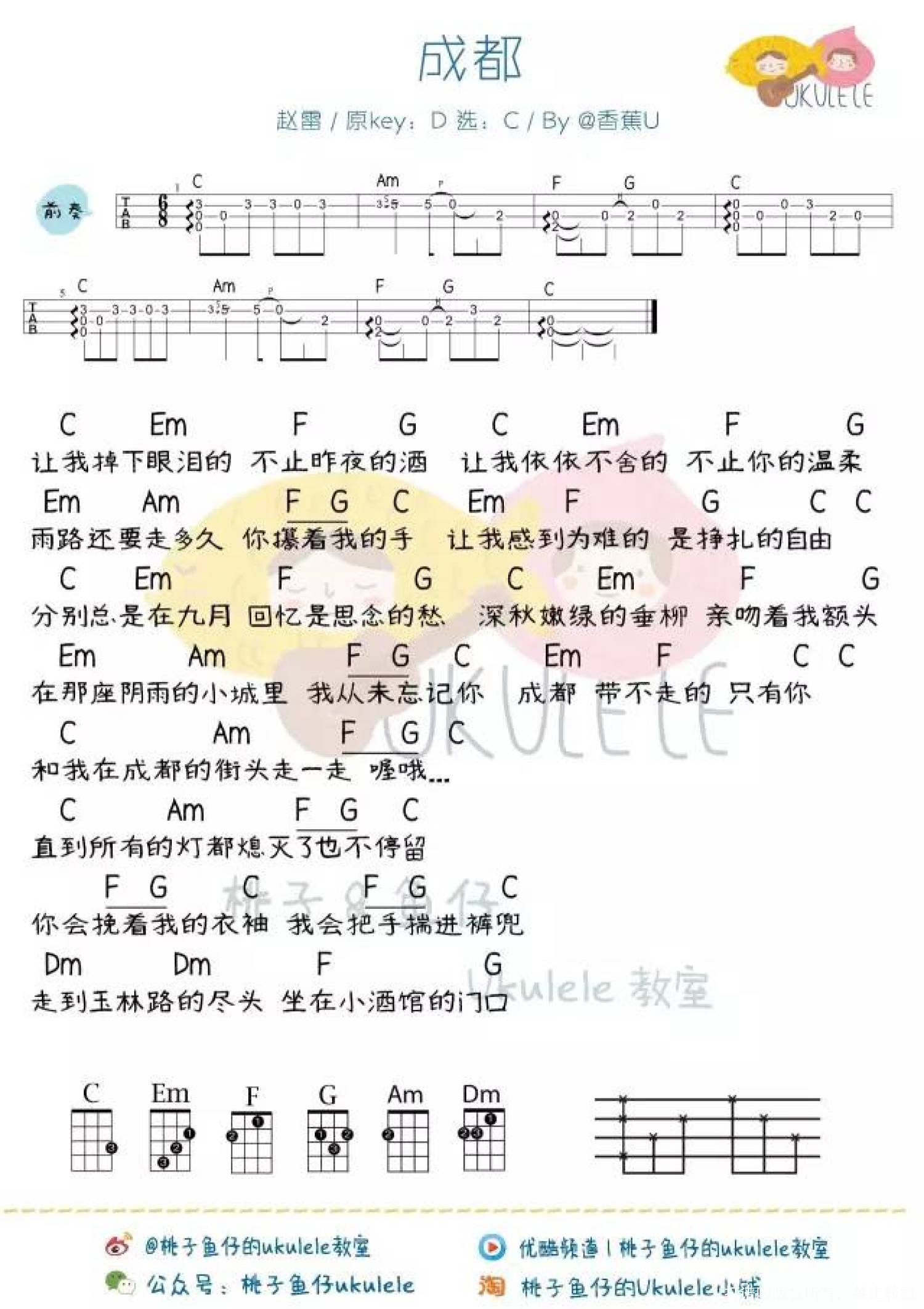 曲谱介绍: “你会不会因为一首歌爱上一座城?”“会,比如《成都》”Aloha上周赵雷在<我是歌手>演唱了他早期的作品《成都》,把民谣的如缕清风吹进了观众的耳朵。很温暖,很感动,一夜之间刷遍了朋友圈。(所以最近每100条留言里有50条是求成都教学的!)这首歌在赵雷粉丝群体中有着很高的声誉,2016年10月24日录音室单曲首发,随即刷爆网络,随后也收录在赵雷第三张个人专辑《无法长大》当中。赵雷用简单纯粹的语言,动听的旋律,最直接的方式,感染了很多听过这首歌的年轻人。成都是赵雷最钟爱的城市之一,如同所有多情的游子一样,在他“流浪”全国的途中,成都是非常重要的一个站点。辗转过很多地方,总会有一些他乡成为故乡。赵雷在创作时认为成都慢悠悠又极具人情味儿和生活气息的感觉让他特别喜欢,所以只要有机会去成都演出就会挺高兴。很多人觉得这首歌是写给一个人的情歌,其实是赵雷写给一座城的情歌;而写这首歌的理由很简单,想表达对这座城市的记录和留恋。一把吉他,和略带颗粒感的嗓音,没有太多的炫技 只有娓娓道来,干净的旋律里藏着让人莫名想掉泪的深情。在民谣的世界里,赵雷用自己的声音温暖着每一个人。而我们,希望一直被他所温暖。数不清的游子喝着小酒谈论着这座阴雨的小城回忆那时拥有着的爱情... 带不走的成都Ukulele&Guitar Cover教学&曲谱①C调(男女生都可演唱)②G调(女生可演唱)他乡也会变故乡你是否也思念着一座城?