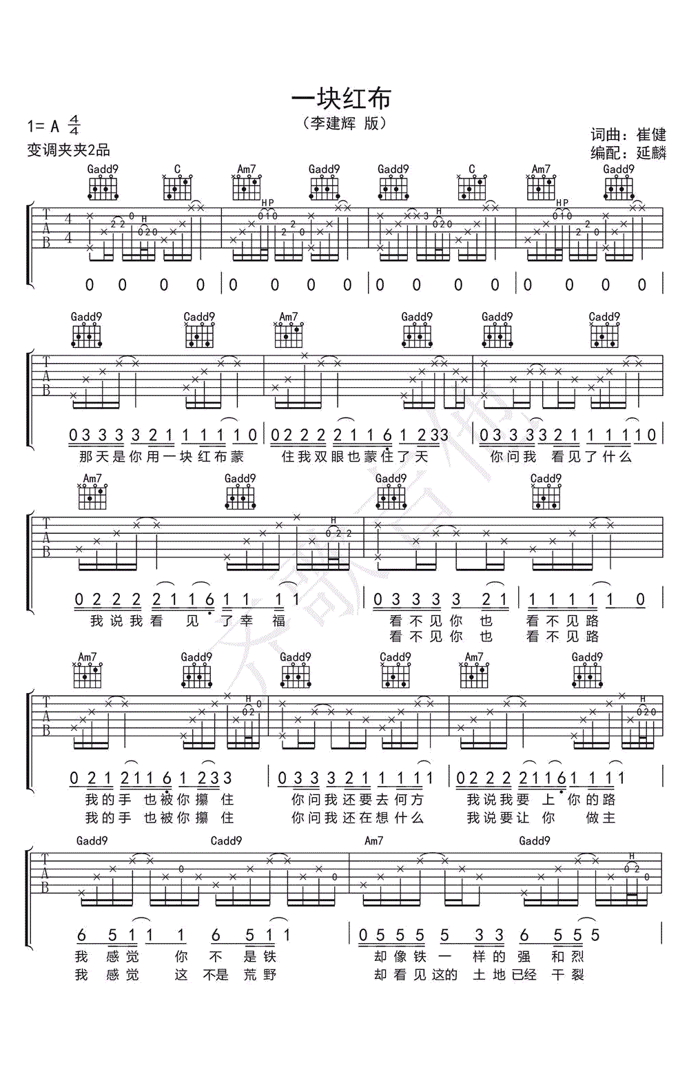 曲谱介绍: 一块红布吉他谱是根据歌手崔健的经典歌曲改编的吉他谱。歌曲原调A调,吉他谱采用C调指法编配,变调夹夹二品。摇滚的经典那是个时代的不朽之作。崔健用那沧桑的声音演绎了这首歌曲。歌词没有华丽的辞藻深意有些直白。就是这样的一首歌曲情真意切,用那沧桑的氛围表达了对爱情的渴望。喜欢崔健一块红布歌曲的朋友不要错过哦,这首歌是一首摇滚风格的歌曲。旋律比较简单但是能抒发出那种狂野和不羁的感觉。为了爱情的那种执着和坚定的信念。谱子里注意击弦和连音的技术。多练习就可以熟练弹奏了。更新了(版本二、和版本三)供大家参考。琴谱网编辑整理》