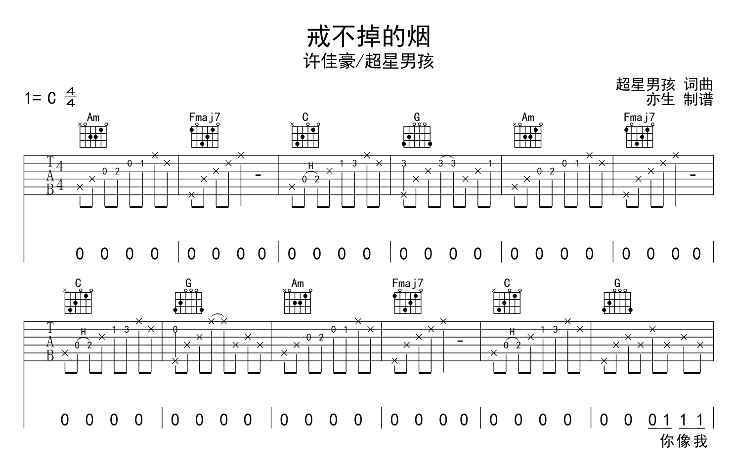 戒不掉的烟吉他谱 - 许佳豪/超星男孩 - C调吉他弹唱谱