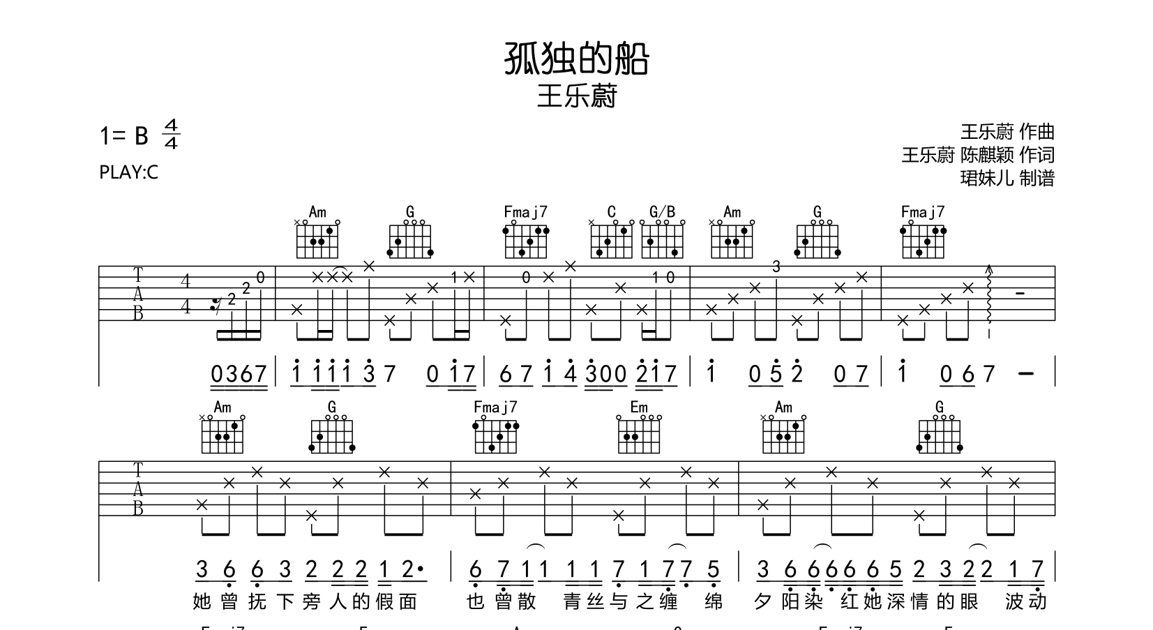 孤独的船吉他谱 - 王乐蔚 - C调吉他弹唱谱