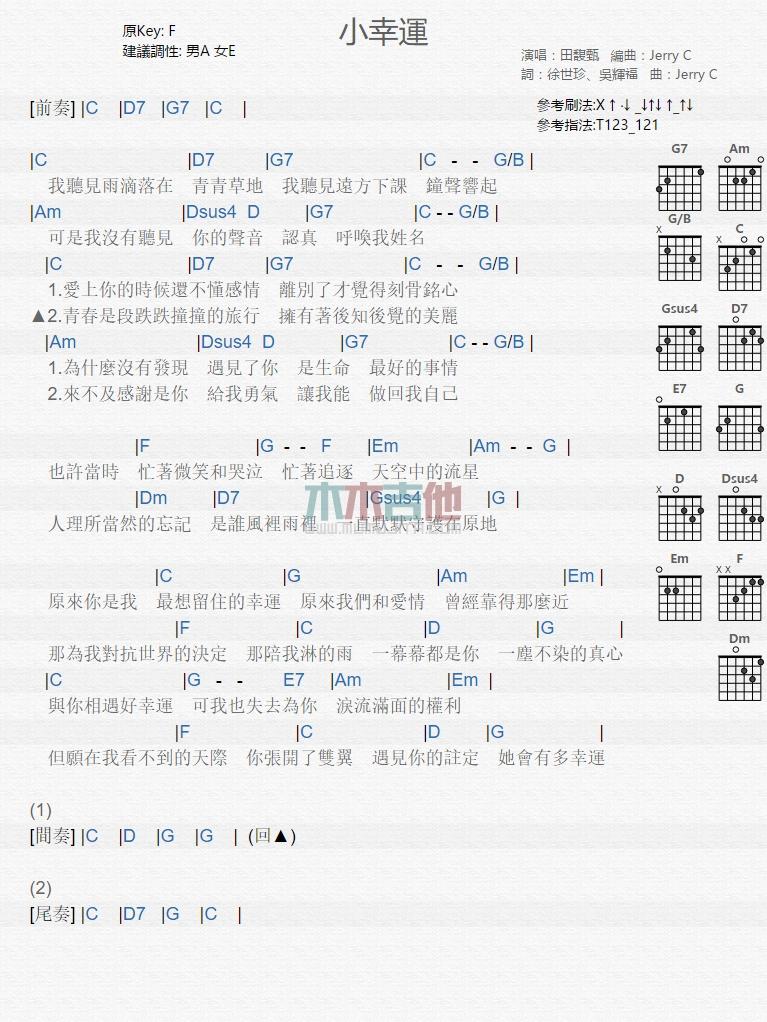 曲谱介绍: 田馥甄《小幸运》吉他谱,小幸运六线谱,原调F,Capo夹五品,请根据自己音域选择变调夹品位。我少年电影的主题曲,每一次遭遇都是命运的结果。意外的遭遇是命运的结果。我希望所有的知识都是我们的小运气。