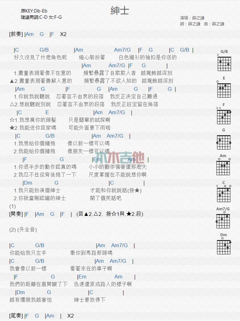 曲谱介绍: 绅士吉他谱_薛之谦_《绅士》C调原版六线谱_吉他弹唱教学分享。《绅士之歌》是由音乐天才创作和演唱的。薛之谦的歌声深沉而深情。它深刻地诠释了悲伤。他的歌声不仅变得更加成熟,而且对细节的处理也更加精细。