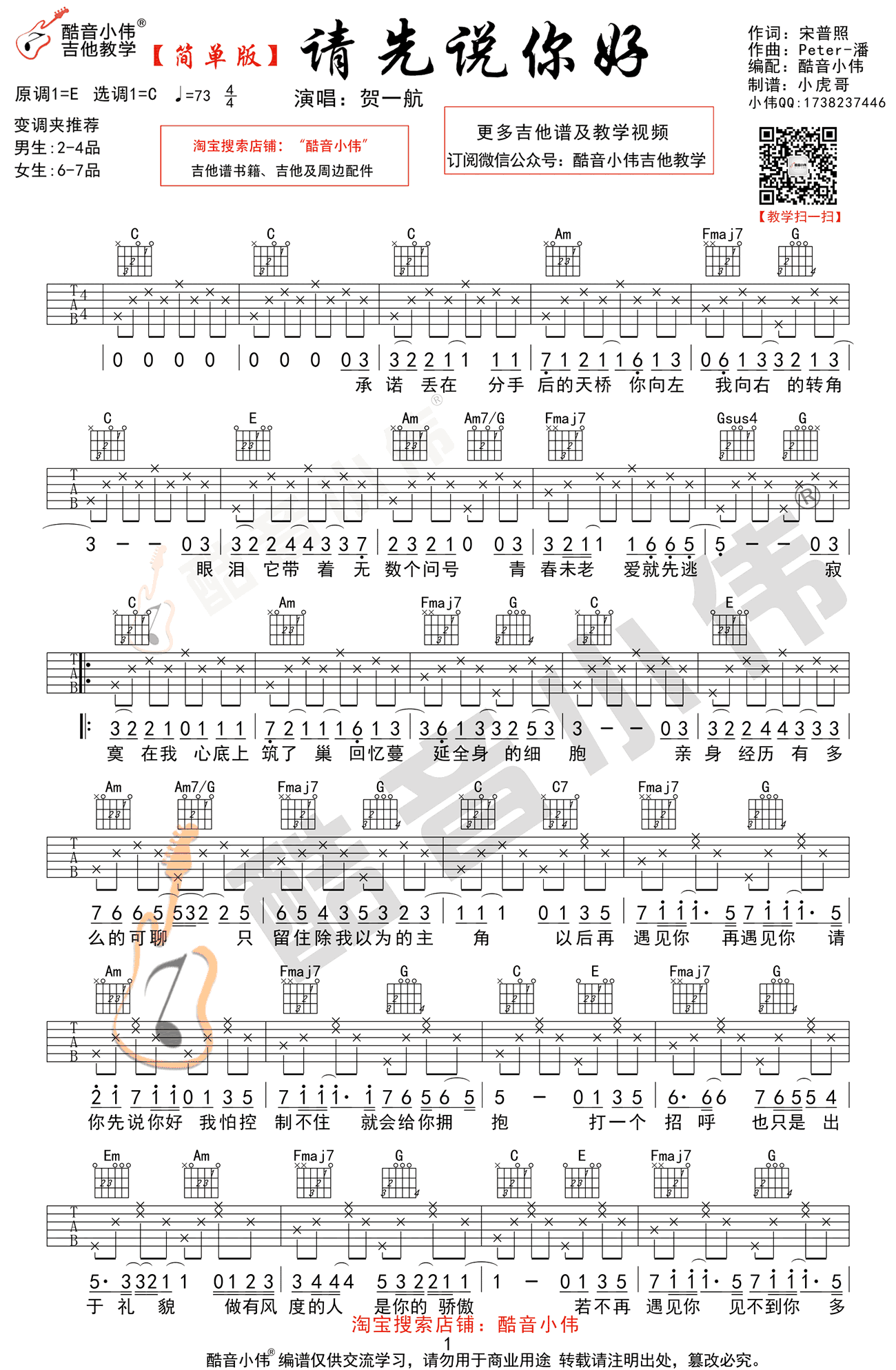 曲谱介绍: 请先说你好歌曲是歌手贺一航演的根据此歌曲编配的吉他谱,采用C调简单弹唱版。沙哑的嗓音把这首伤感情感表达了出来,对爱情的无奈,对感情的执着。此吉他谱男生变调夹夹2-4品,女生推荐夹6-7品。感谢酷音小伟编谱。琴谱网上传。