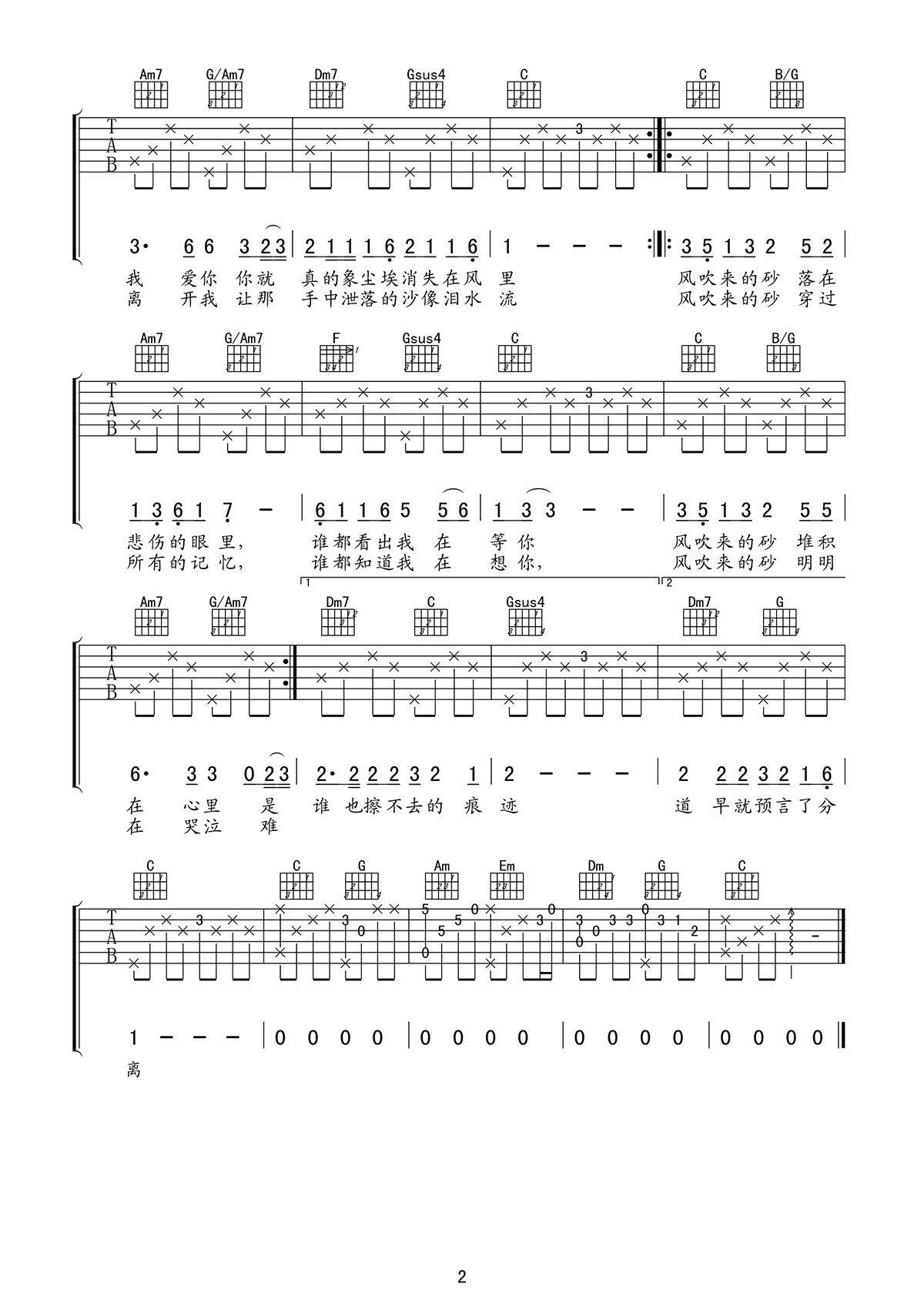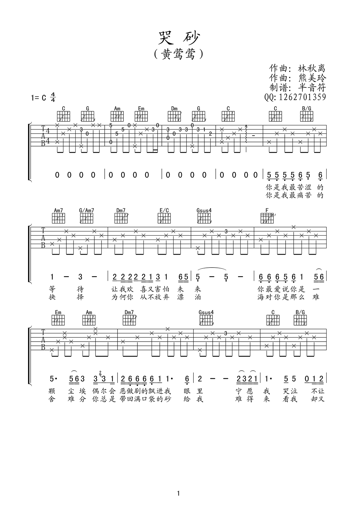 哭砂吉他谱 - 黄莺莺 - C调吉他弹唱谱