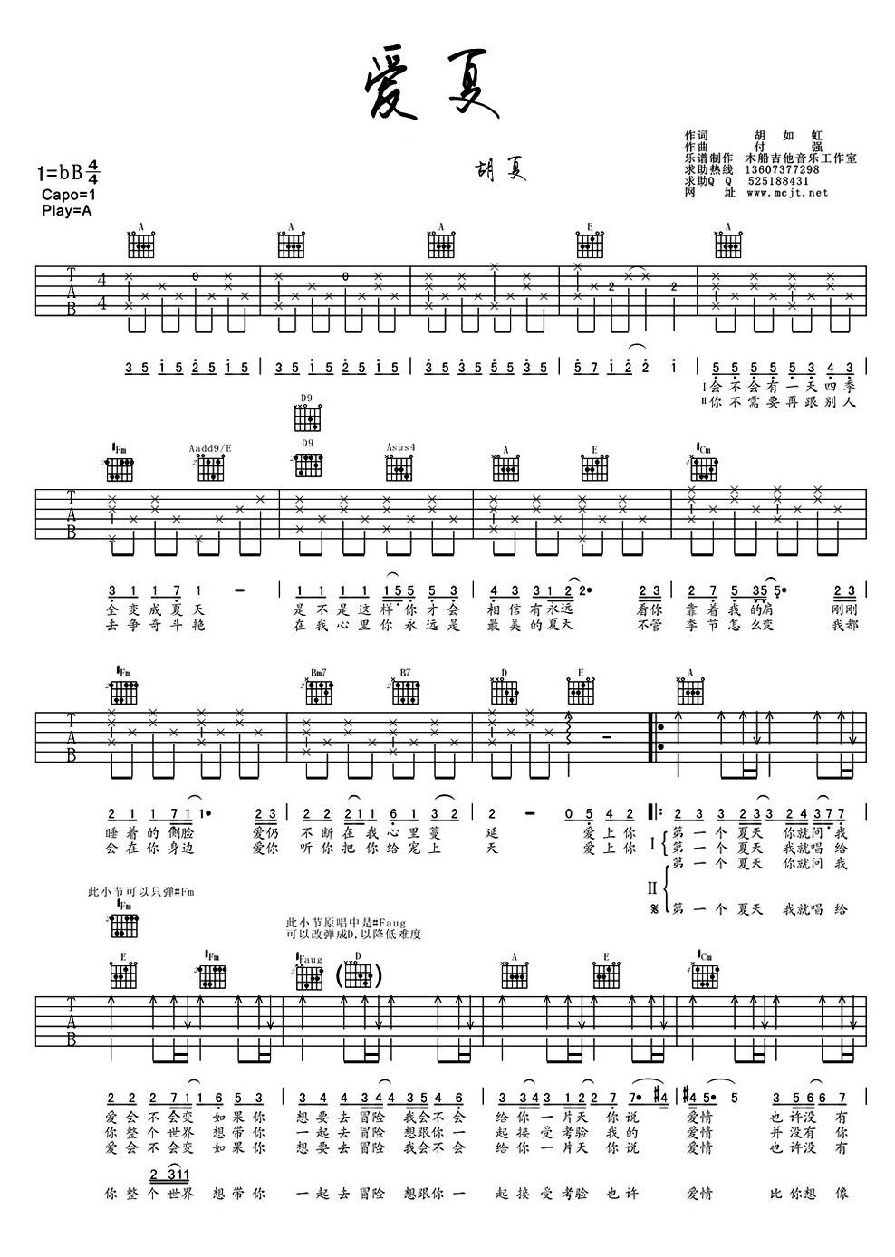 曲谱介绍: 爱夏吉他谱是根据歌手胡夏歌曲编配的谱子,原曲A调。感谢木船吉他工作室编辑该曲谱。琴谱网编辑分享。一首甜蜜夏日的爱情歌曲,加上吉他的伴奏。喜欢的朋友一定要弹弹哦。