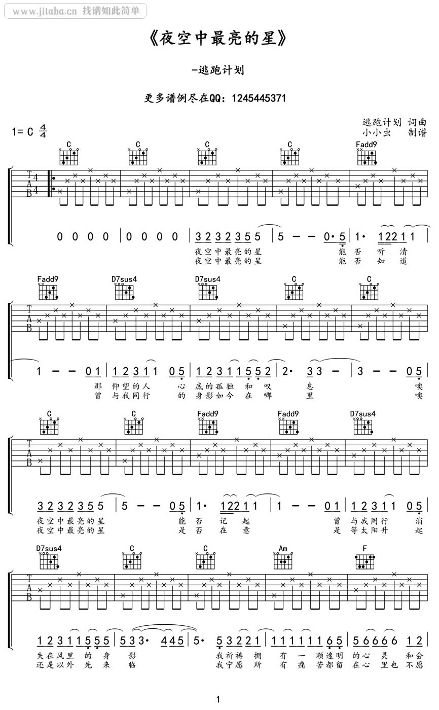 曲谱介绍: 夜空中最亮的星是根据逃跑计划乐队的一首成名曲改编的吉他谱。吉他谱采用C调指法编配。感谢小小虫编配该吉他谱。曲子非常唯美,夜空下的宁静和空寂的美感,让人陶醉。喜欢逃跑计划乐队的朋友一定要试试这首歌哦。