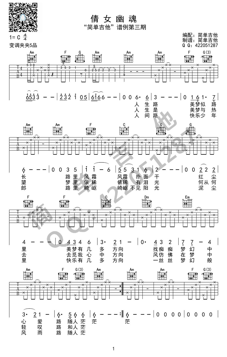 曲谱介绍: 倩女幽魂吉他谱是根据张国荣的一首歌曲改编的吉他谱。吉他谱采用C调指法编配。弹奏的时候变调夹夹5品。感谢简单吉他编辑该吉他谱。一首经典影视歌曲,人鬼情未了。那个年代的经典电影。这首歌曲的曲子也是借鉴了,著名大提琴曲子《殇》。曲调凄凉。人生如梦就像是爱情的虚无缥缈。
