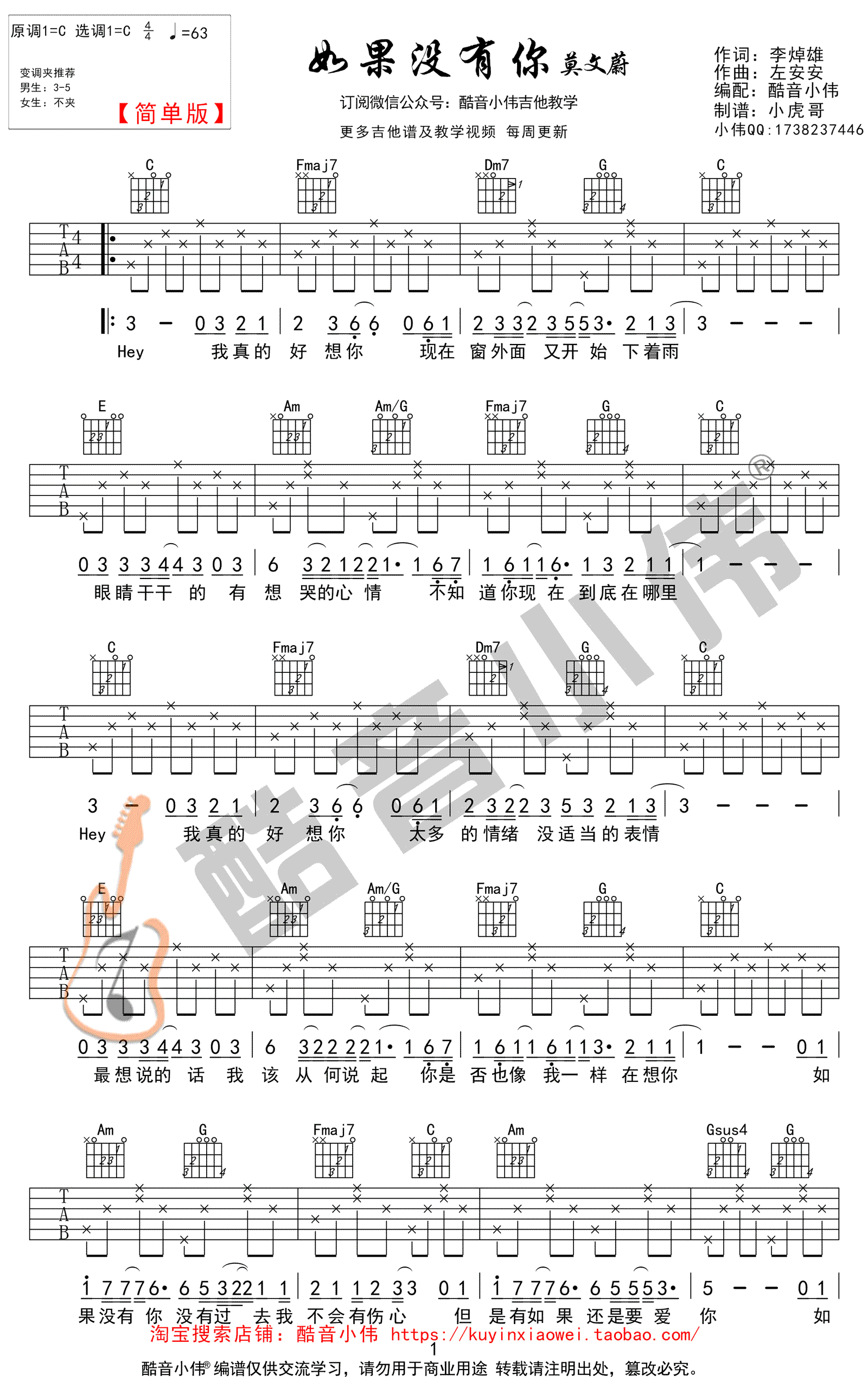 曲谱介绍: 《如果没有你》吉他谱是根据莫文蔚的一首歌曲编配。吉他谱采用C调编配,弹奏的时候变调夹夹3-5品。莫文蔚的嗓音特别适合唱这种甜蜜爱情歌曲。一种小女人的姿态来演绎这首歌曲。加上吉他唯美的伴奏,是那么的好听。歌词写得很好。喜欢这首歌曲的朋友记得分享哦。琴谱网编辑整理#