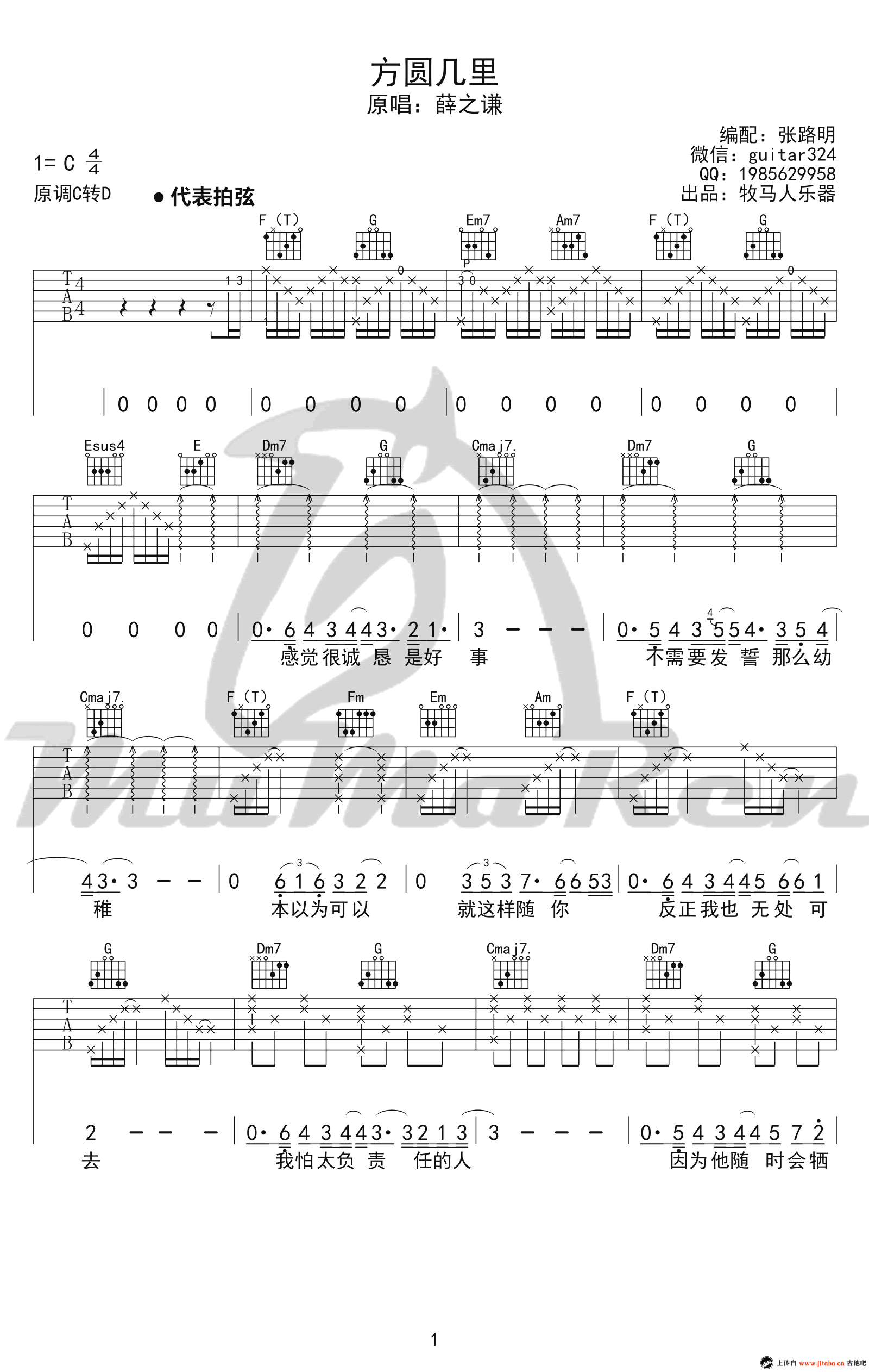 曲谱介绍: 《方圆几里》吉他谱是根据歌手薛之谦的歌曲编配的吉他谱。歌曲原调C转D,吉他谱用C调指法编配。这首歌曲旋律柔美充满了伤感。加上薛之谦那独特的抒情嗓音。让这首歌曲有不一样的感受。这首歌曲是最熟悉的陌生人主题曲。歌曲中对感情的美好期望,和最终不能挽回的悲伤。加上吉他的伴奏,弹唱起来能很好的烘托出那种爱恨别离,难舍难分的伤痛。感谢牧马人编配此吉他谱,琴谱网上传。