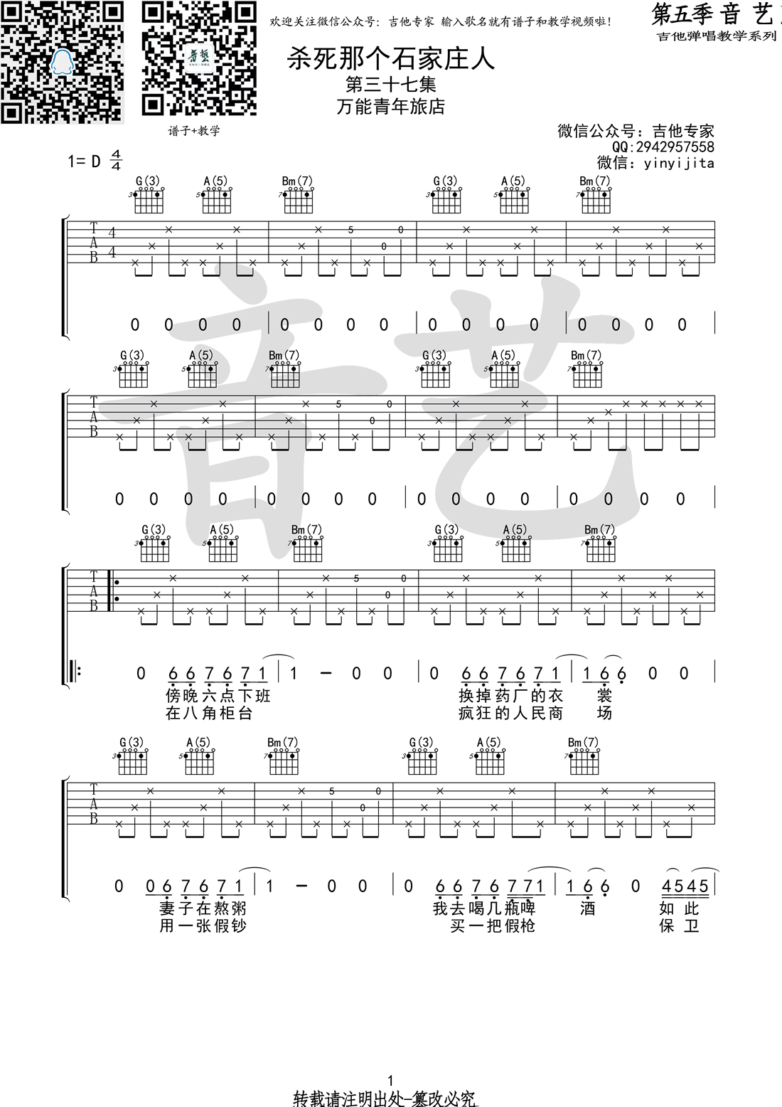杀死那个石家庄人吉他谱 - D调吉他弹唱谱