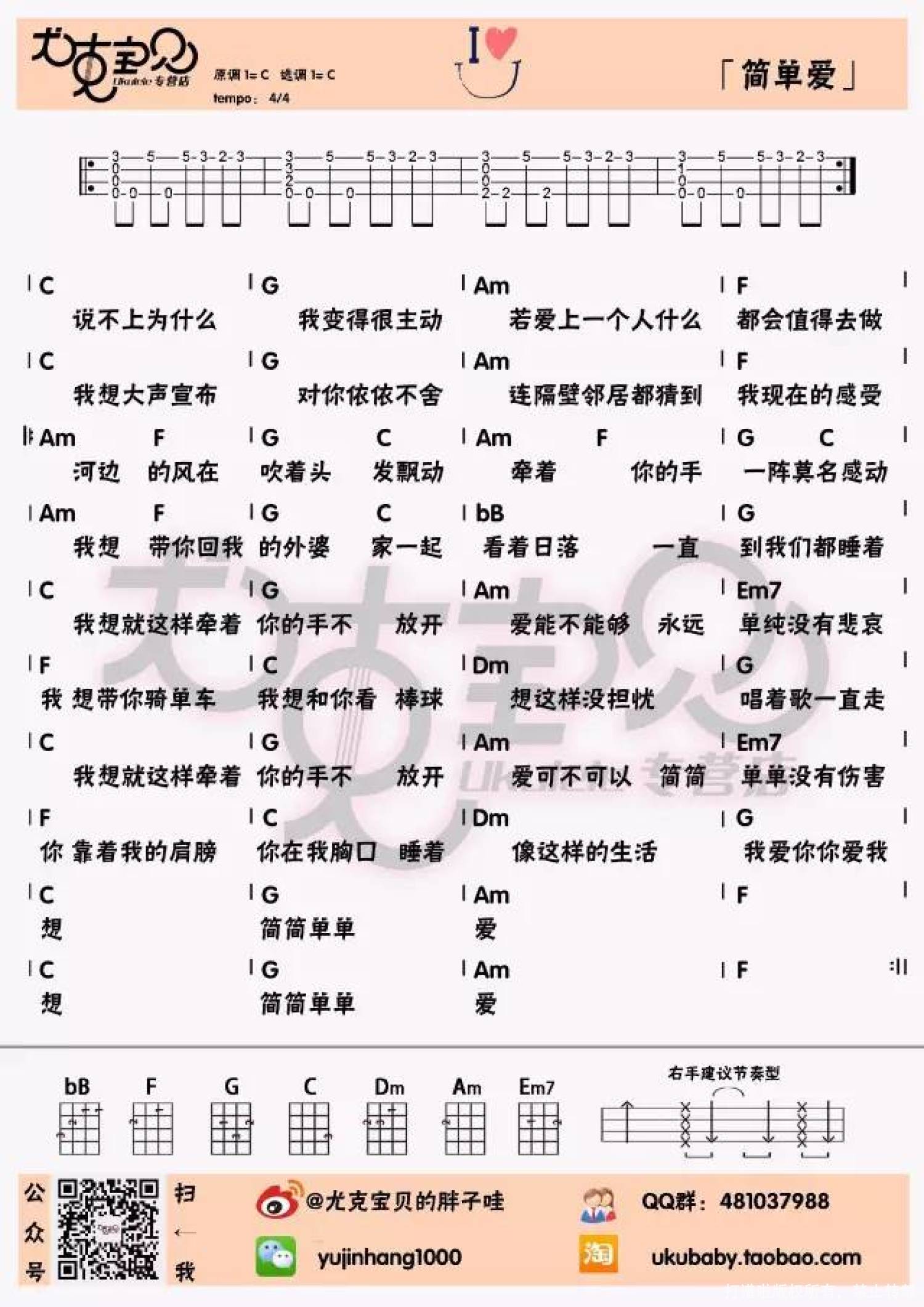 曲谱介绍: 周杰伦《简单爱》_C调尤克里里谱