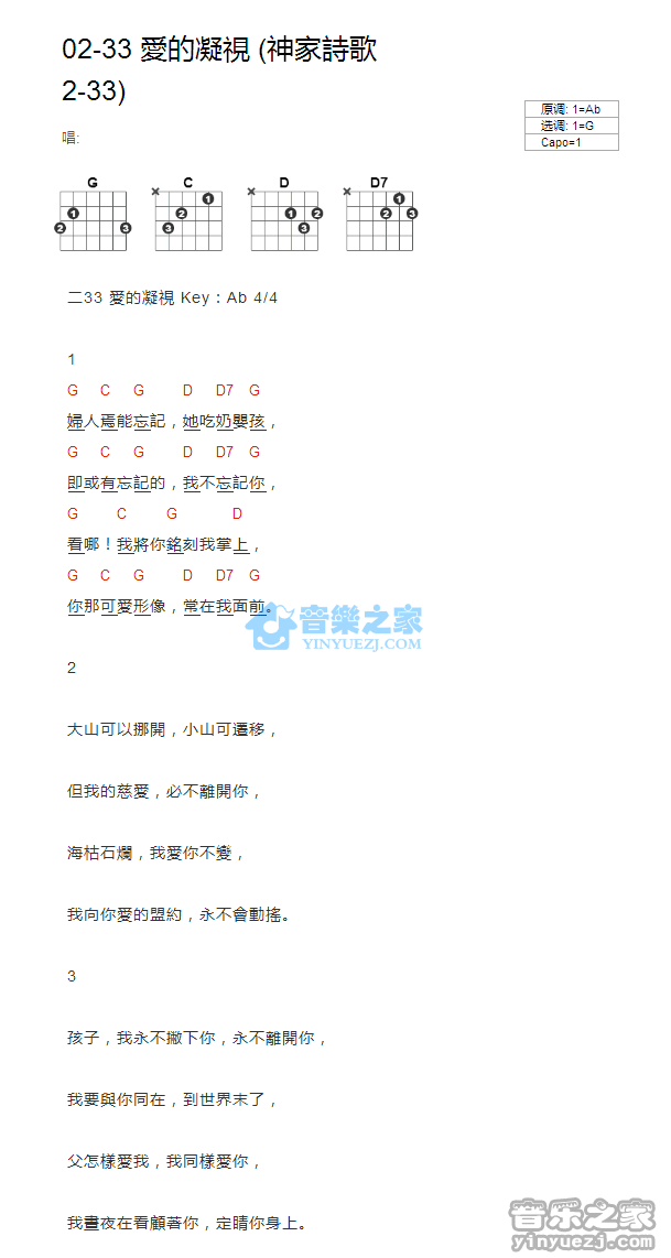 曲谱介绍: 神家诗歌2《爱的凝视》吉他弹唱谱,采用G调指法编配,共有1张高清图谱,免翻页排版设计。