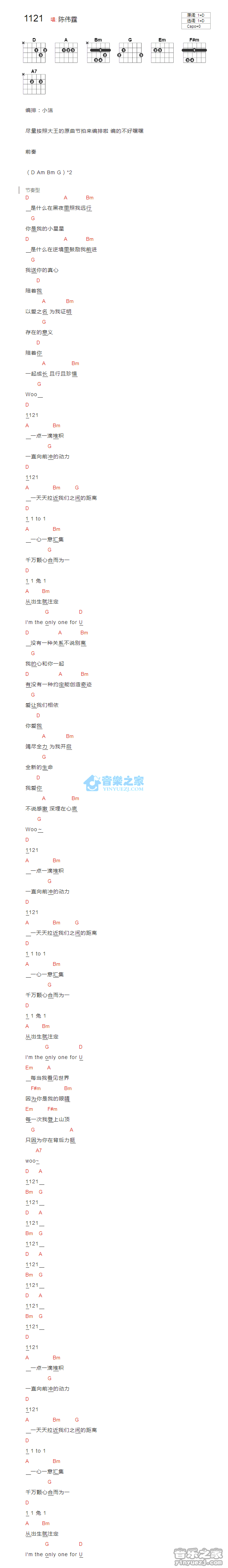 曲谱介绍: 1121《1121_》吉他弹唱谱,采用D调指法编配,共有1张高清图谱,免翻页排版设计。