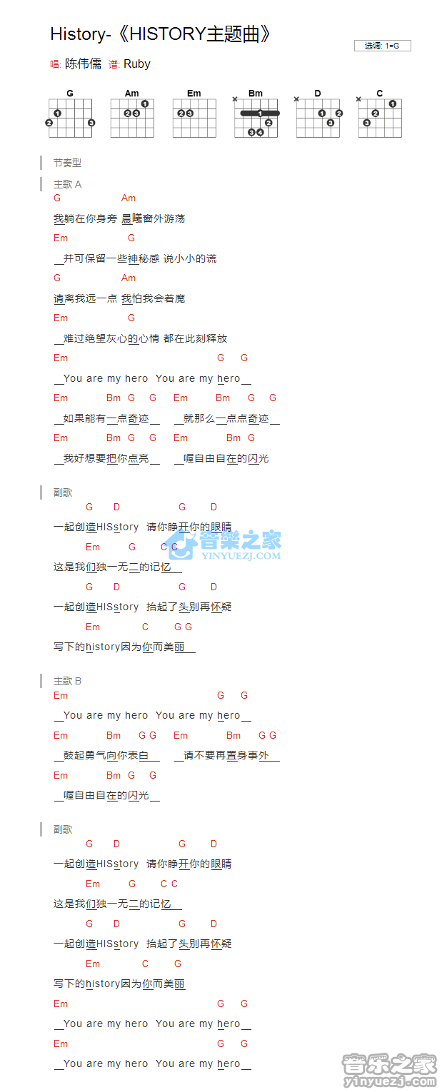 曲谱介绍: History《History_》吉他弹唱谱,采用G调指法编配,共有1张高清图谱,免翻页排版设计。