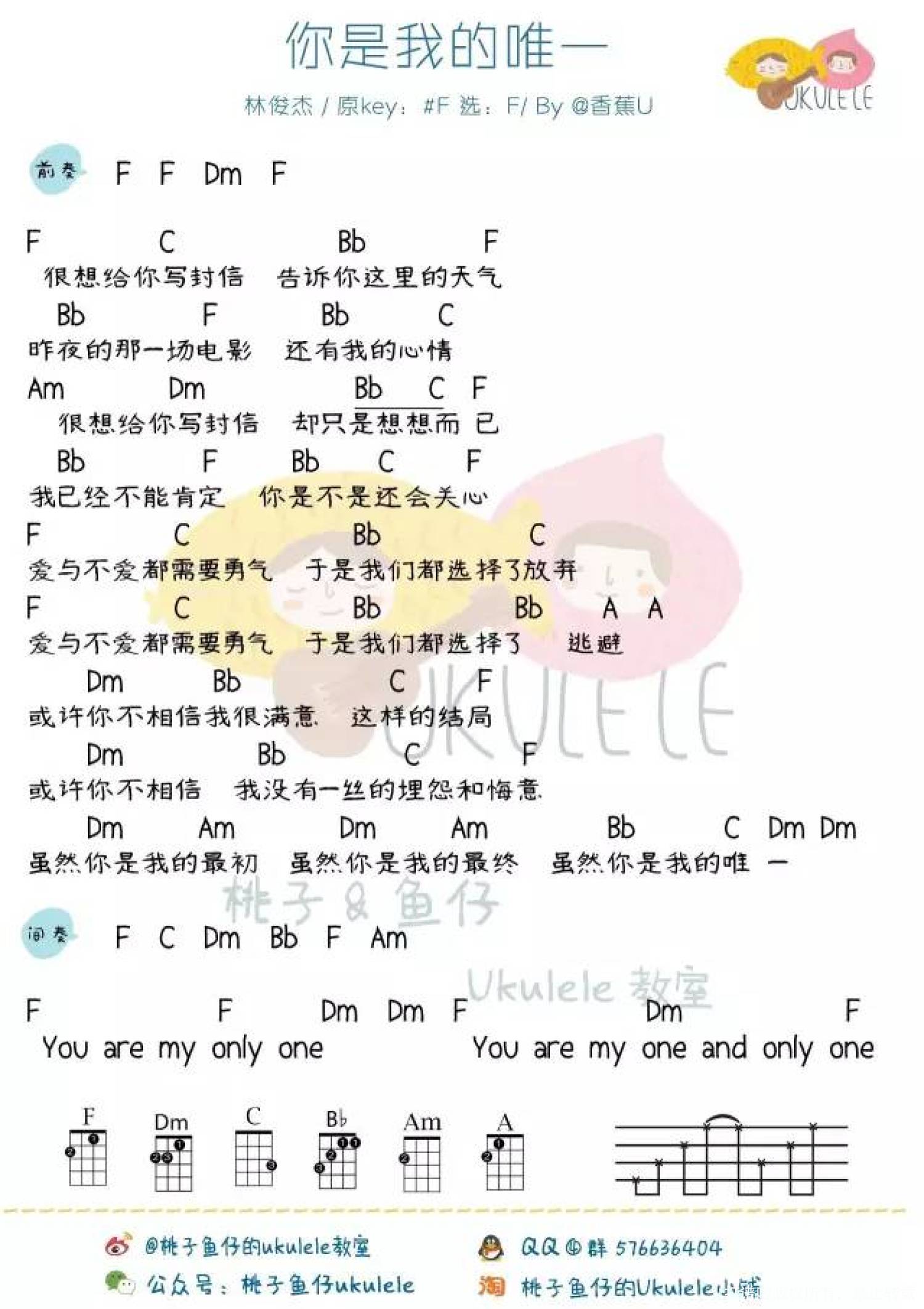曲谱介绍: 林俊杰《你是我的唯一》_F调尤克里里谱