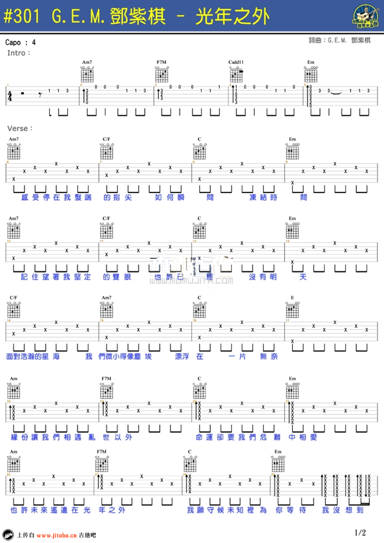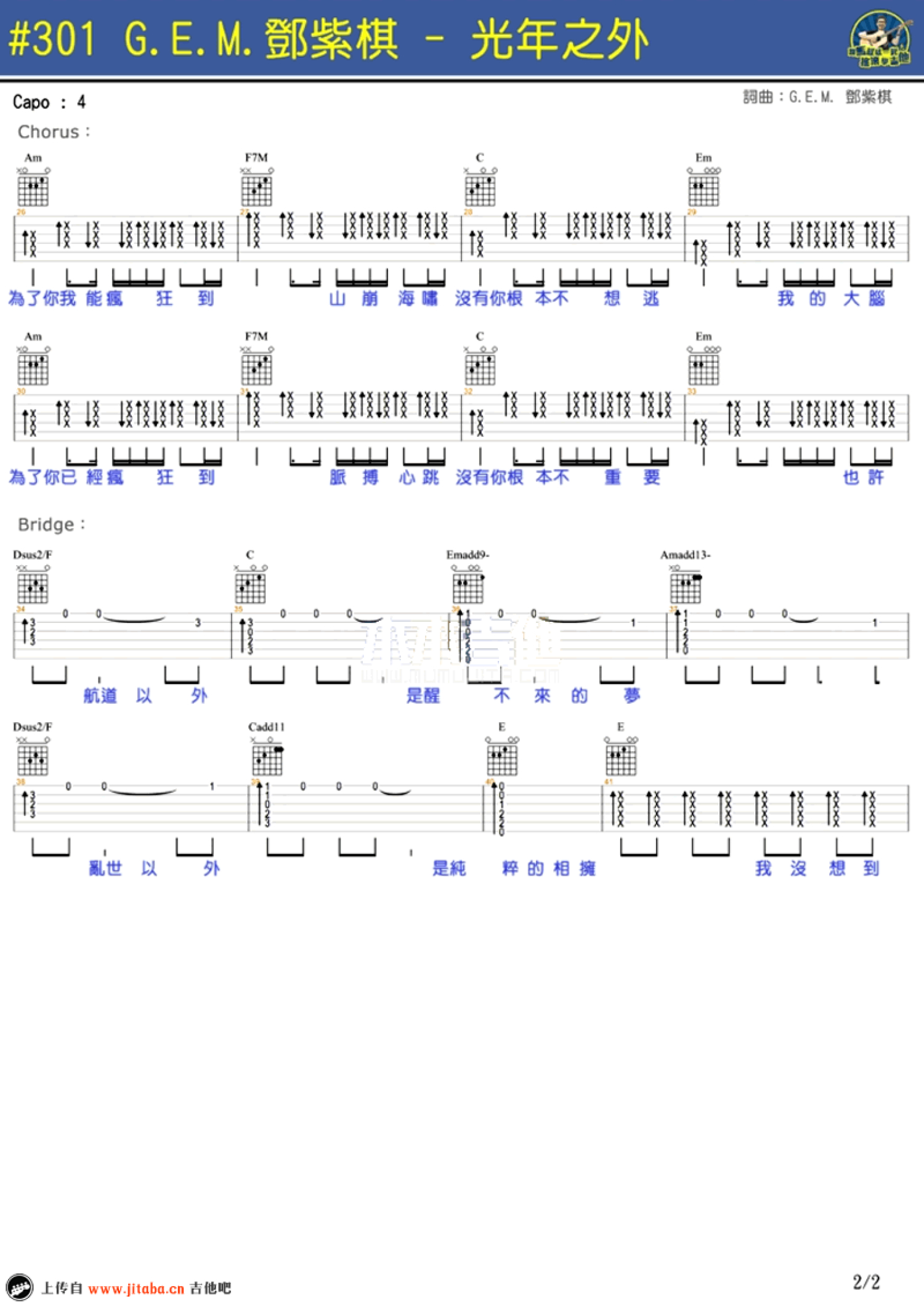 曲谱介绍: 光年之外吉他谱,邓紫棋演唱,《太空旅客》主题曲,采用变调夹夹四品。为方便琴友们学习,