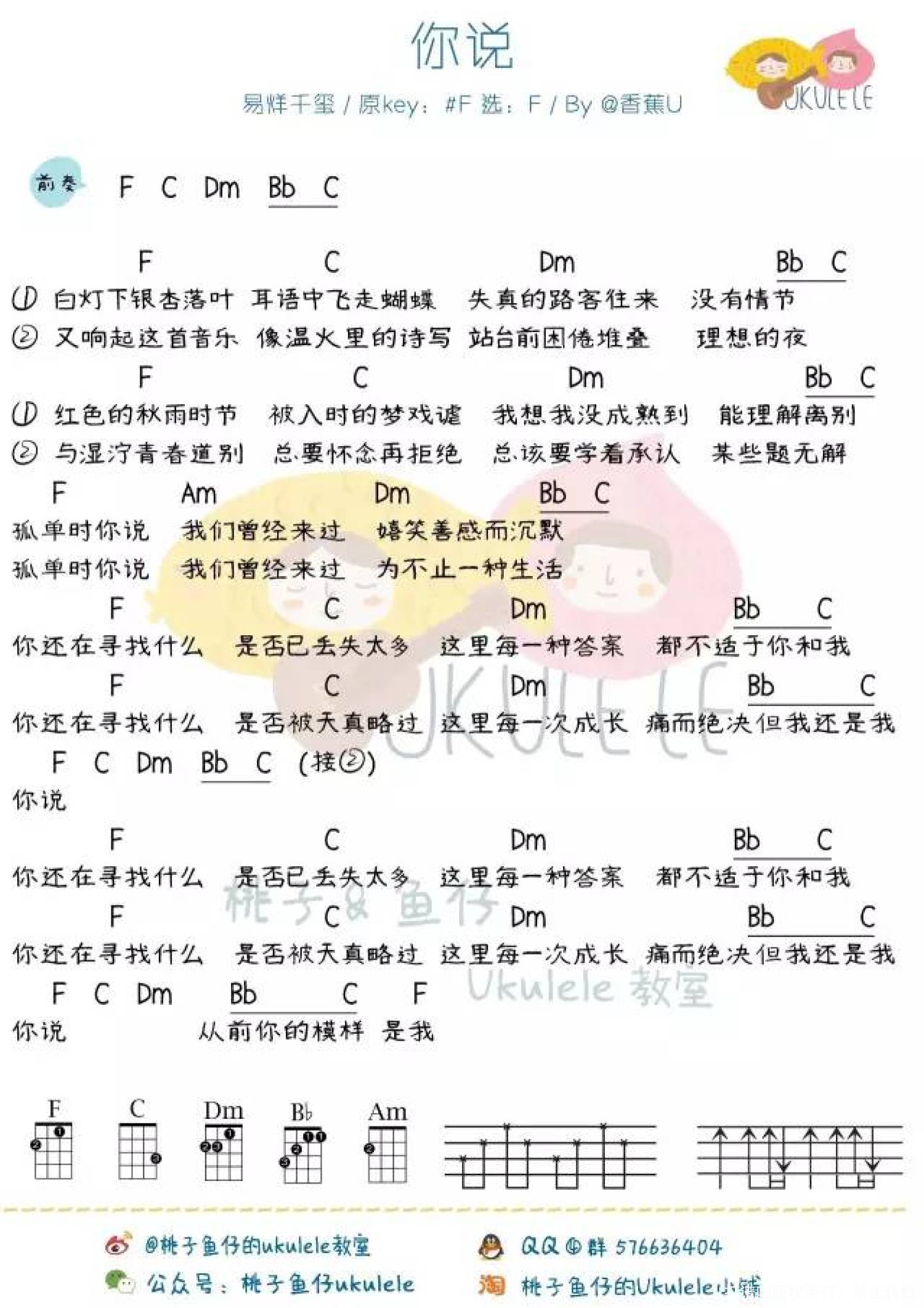 曲谱介绍: 易烊千玺《你说》_F调尤克里里谱