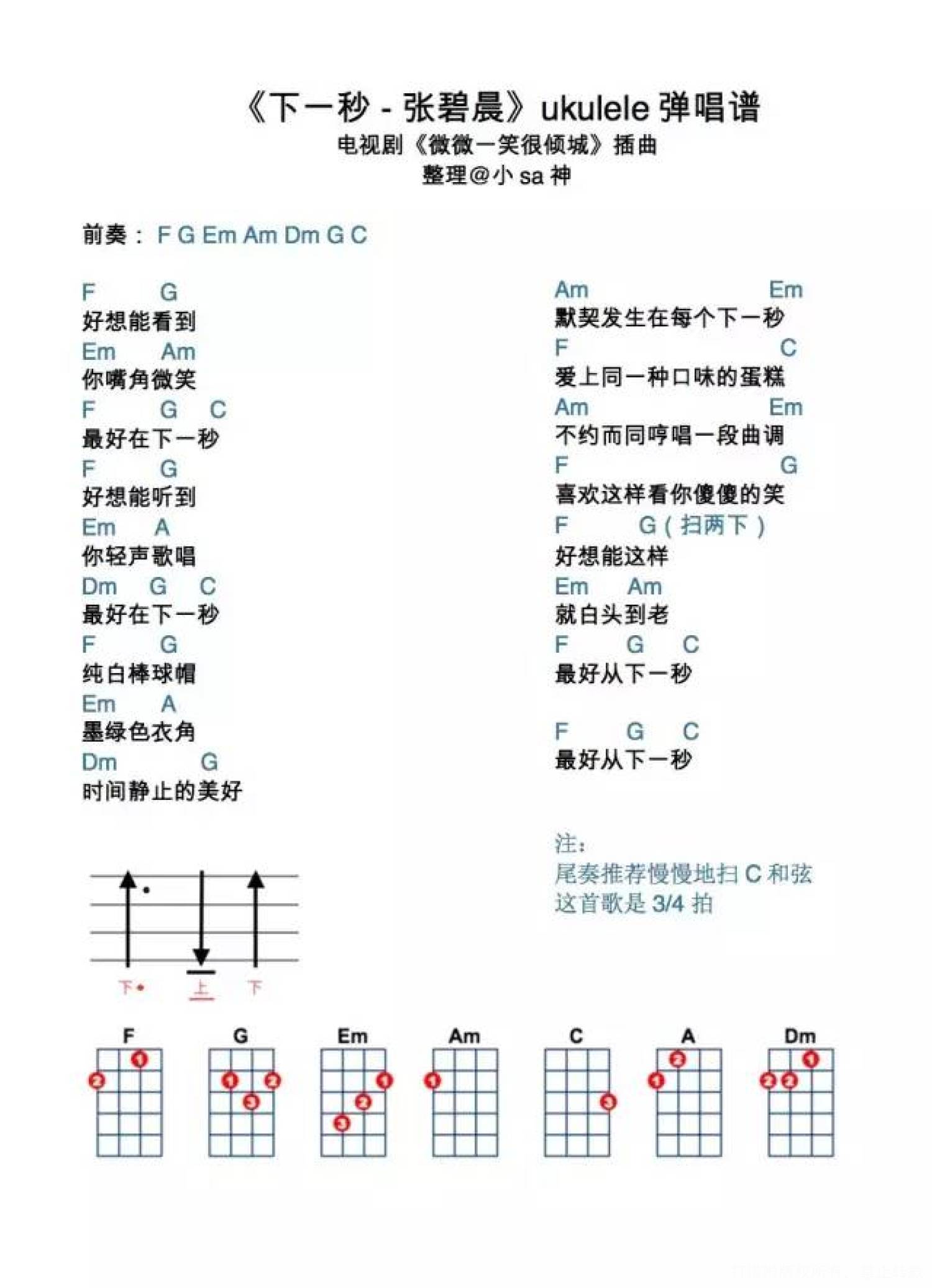 曲谱介绍: 最近被一个电视剧甜到,主演们颜值那么高就算了,还分分钟放大招。虽然我已经有了彦祖,但是看到这样的画面,也莫名其妙(满足脸)地被喂了一嘴狗粮。……打住,收起迷妹花痴脸!《微微一笑很倾城》最让我爱上的其实是一首简单的插曲:《下一秒》。华尔兹的浪漫节奏,简单清新的歌词,初听就有一种甜蜜的感觉荡漾了~来听听看本宝是怎么唱的吧!这里热烈欢迎我的“双胞胎妹妹”,小肉sa。(你们猜是左边还是右边?)《下一秒》是一首3/4拍的歌,节奏会和平时大家熟悉的略微不同(蹦擦擦蹦擦擦)。前奏的和弦谱子里给出了,可以根据我视频里的示范,用扫弦+拨弦自由发挥。
