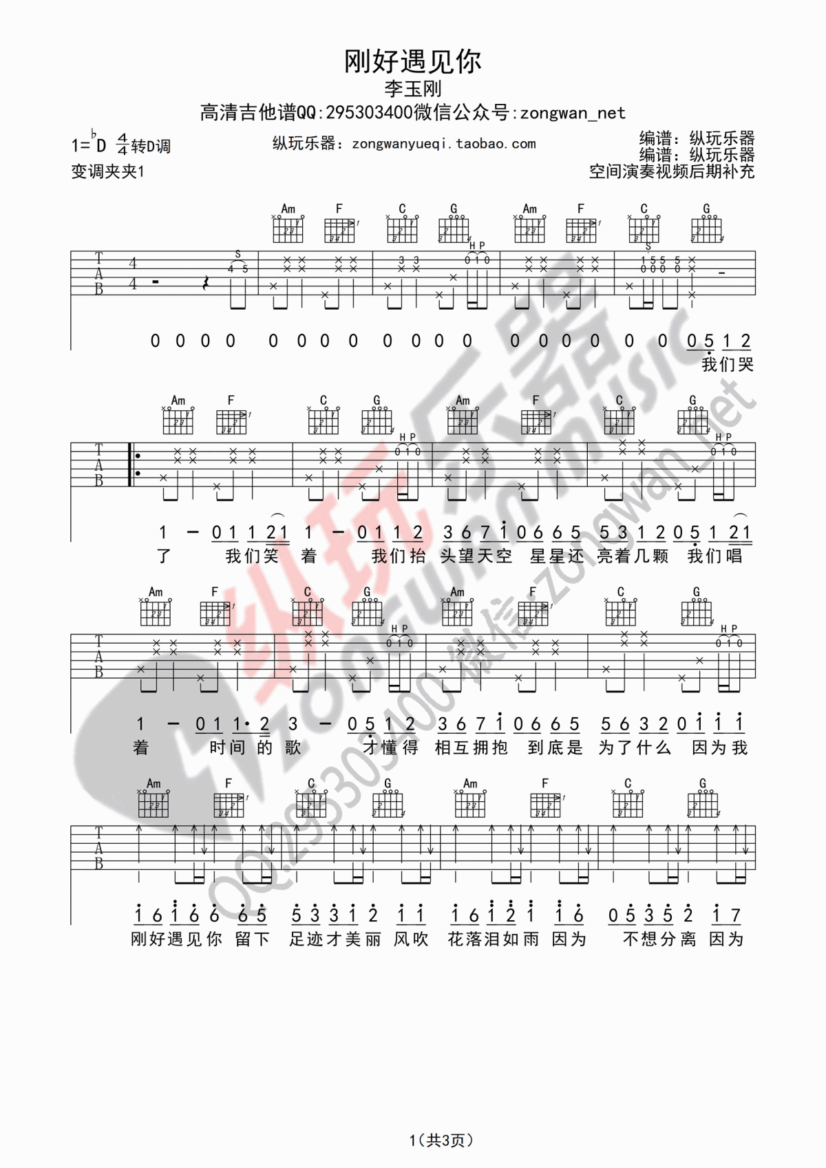 曲谱介绍: 李玉刚《刚好遇见你》吉他谱,刚好遇见你六线谱,变调夹夹一品。