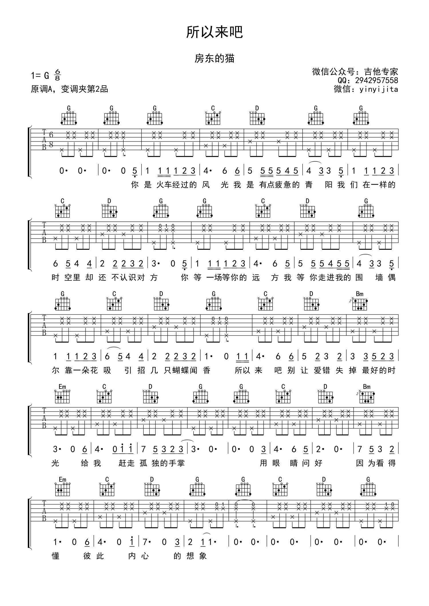 • 所以来吧吉他谱 - 房东的猫 - G调吉他弹唱谱第1张